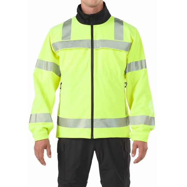 The 5.11 Reversible High Vis Softshell combines superior weather protection and low-light safety in a lightweight, durable frame. Built from 100% polyester bonded material, the Reversible High Vis Softshell features a bright high vis yellow exterior with a generous application of authentic 3M Scotchlite reflective tape, and a reversible interior of laminated nylon for increased resilience in tough environments. Both surfaces repel wind and moisture with ease while remaining flexible, warm, and comfortable. Quick action side zippers allow fast access to a side arm, or can be used for ventilation when temperatures change. Badge tab, Epaulette kit, and pull-out removable ID panels included. Meets ANSI/ISEA 107-2015 Type R & P, Class 2 Certification.
