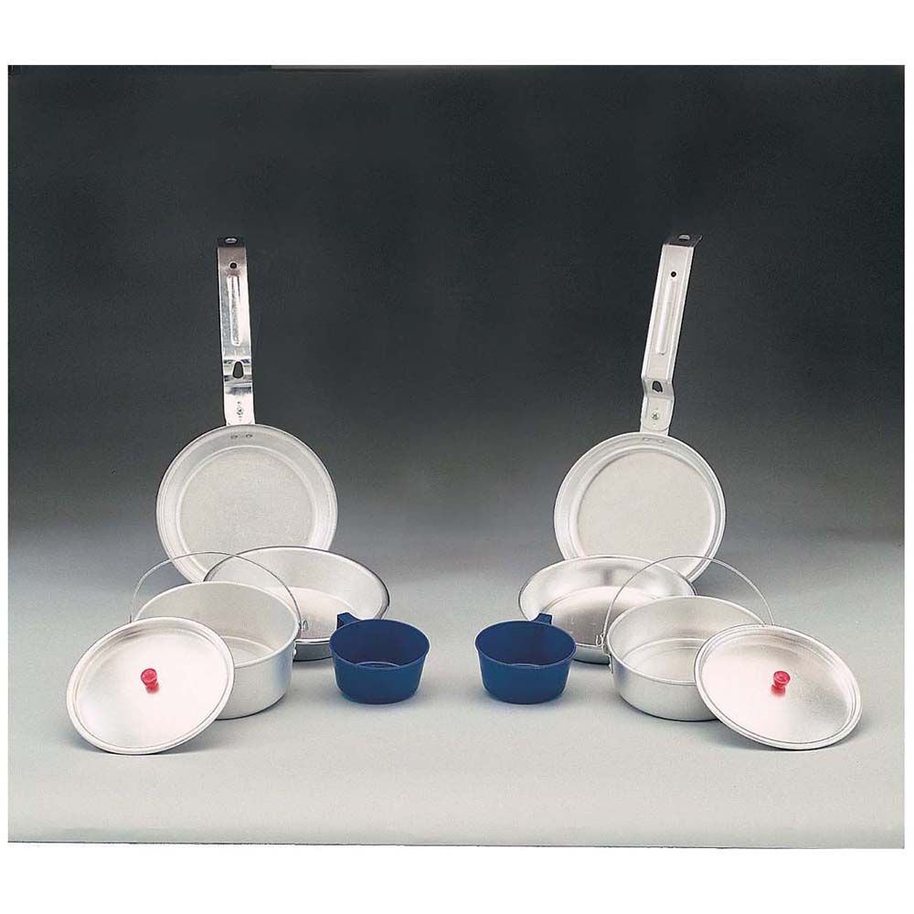 - Complete 5-piece set with frying pan, sauce pan, lid, plate, and plastic cup.