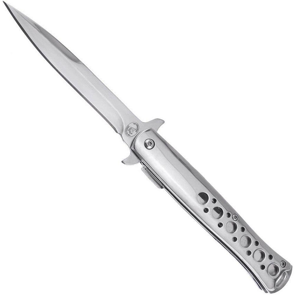 A 9-inch gold stiletto pocket knife is a folding knife with a blade that measures 4 inches in length and a 5-inch handle that is colored in a shiny gold finish. The blade is typically made of high-quality steel and is sharpened to a fine point, making it suitable for piercing and thrusting. The handle is typically made of durable materials such as metal or plastic and is designed to provide a comfortable and secure grip. The gold finish of the handle provides a stylish and eye-catching appearance, and the stiletto design of the blade adds to the knife's overall appeal. These knives are often used by collectors or as decorative items and are not typically intended for heavy use. Due to their size and appearance, they are also sometimes used as a props in theatrical or film productions.