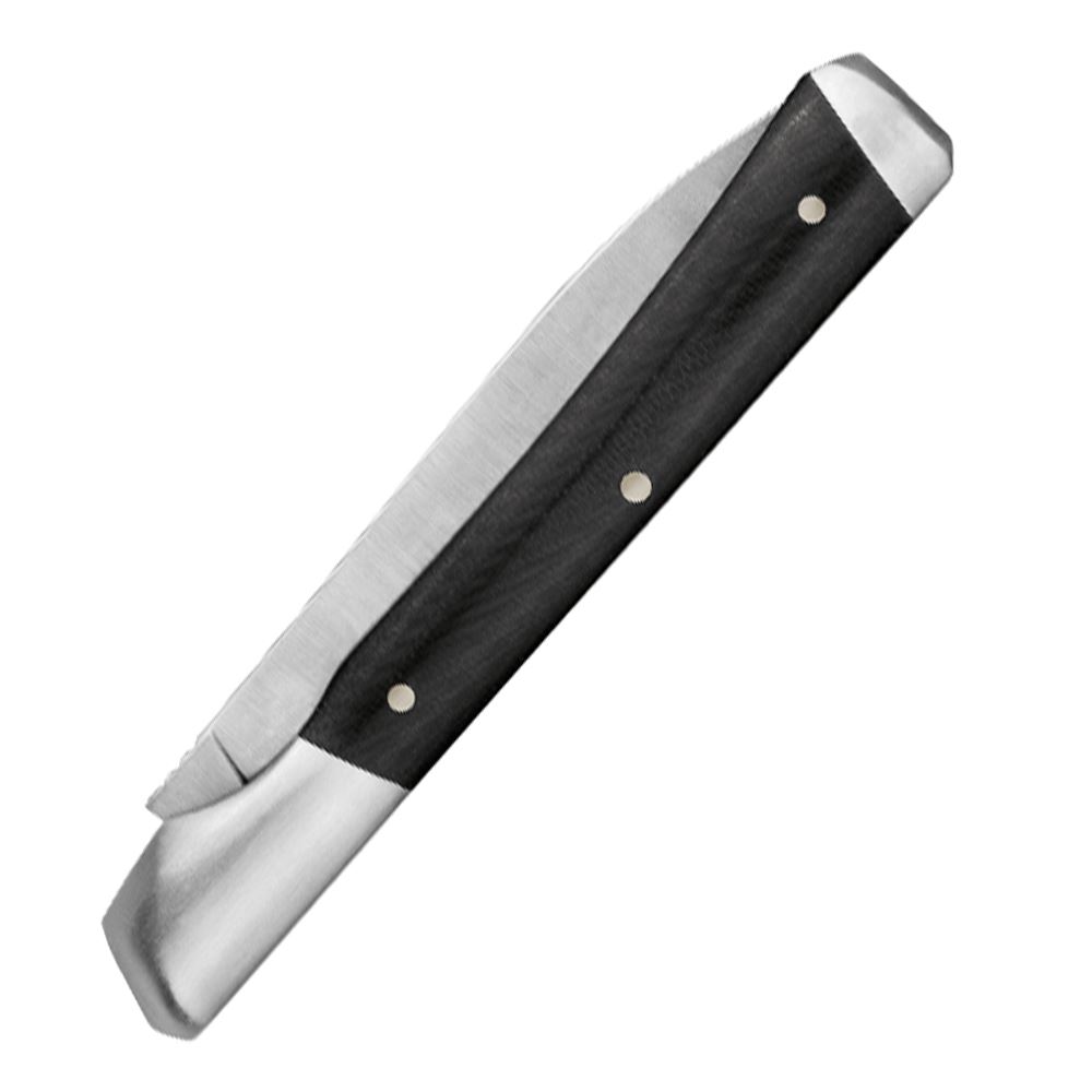 - Polished canvas micarta handle; steel bolsters with steel liners