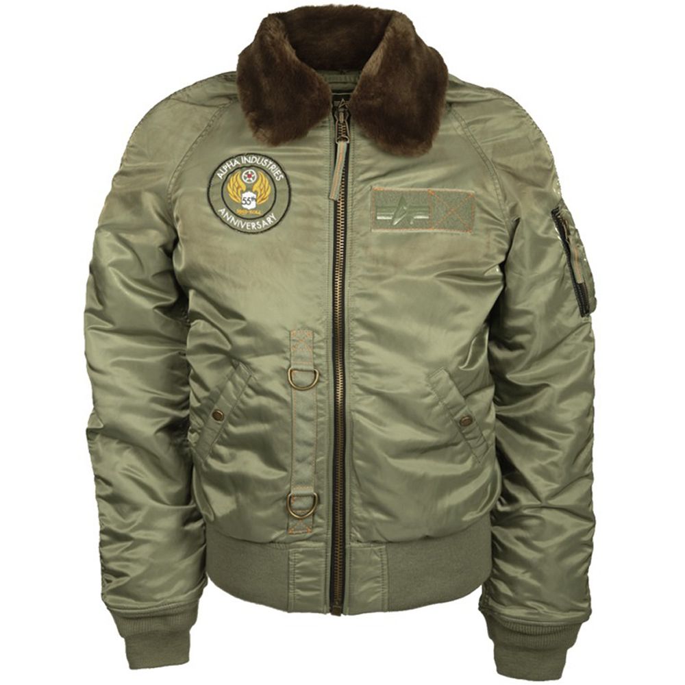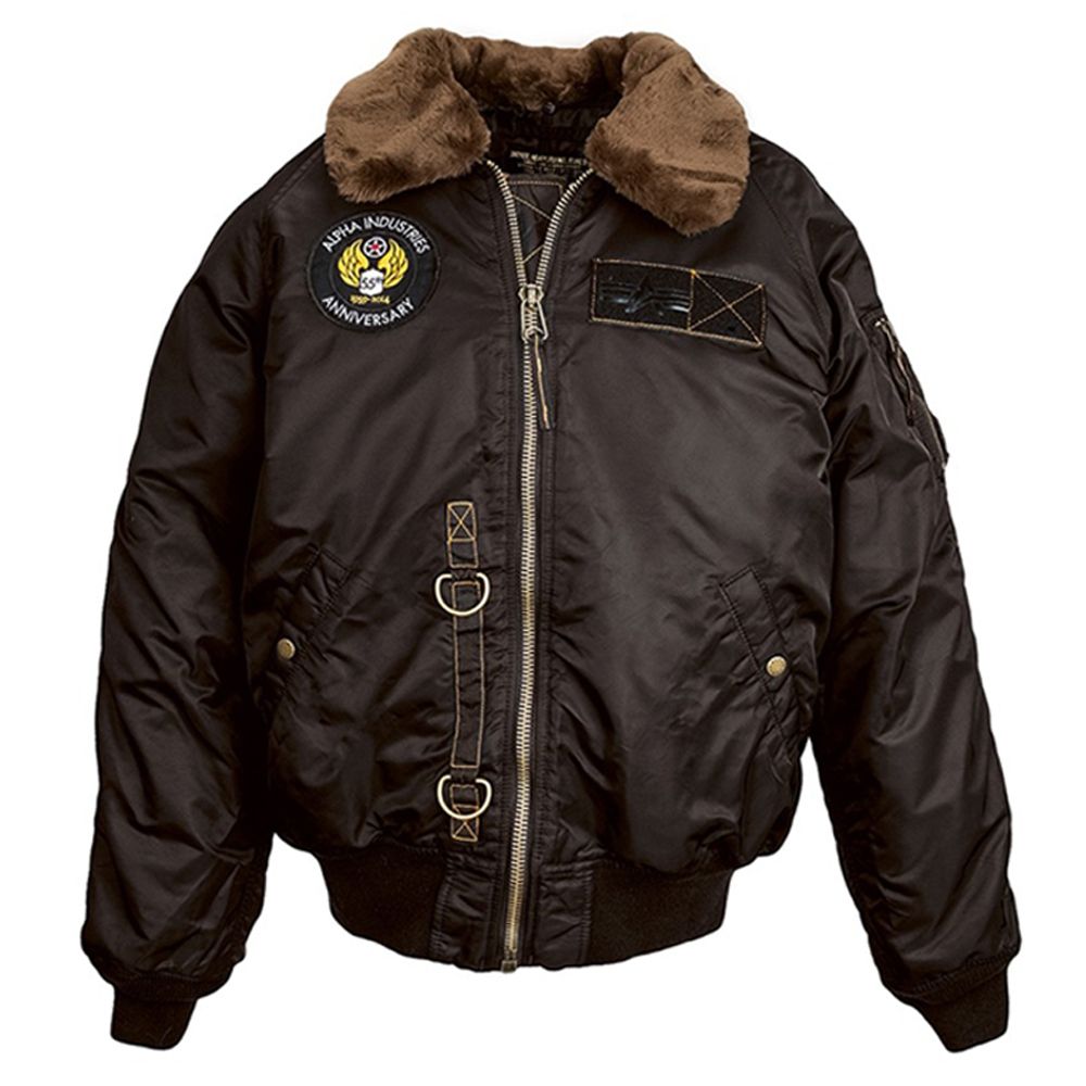 We took our popular B-15 flight jacket and enhanced it with special details to create our limited edition anniversary jacket. The bomber has a special interior metal tab showing its number in the collection. This pilot jacket has a washed flight-nylon shell, a 55th anniversary chest patch and ribbon, D-ring detail on the front and reflective tape, drag handle and screen print on the back. Like the classic B-15, the jacket has a removable synthetic mouton collar, two snap-closure welt pockets and Alpha’s signature zippered utility/pencil pocket.