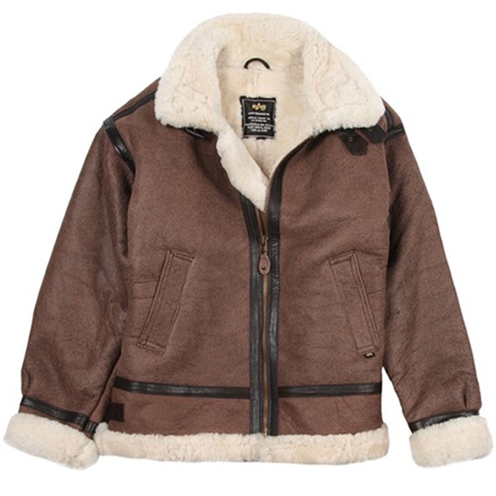 Alphas classic B-3 sheepskin bomber jacket. High quality sheepskin leather, front slash pockets, dual adjustable collar and side buckle straps, antique brass zipper, genuine cowhide leather accents and seam reinforcements, and genuine sheepskin sherpa lining. Fabric: Genuine sheepskin leather.
