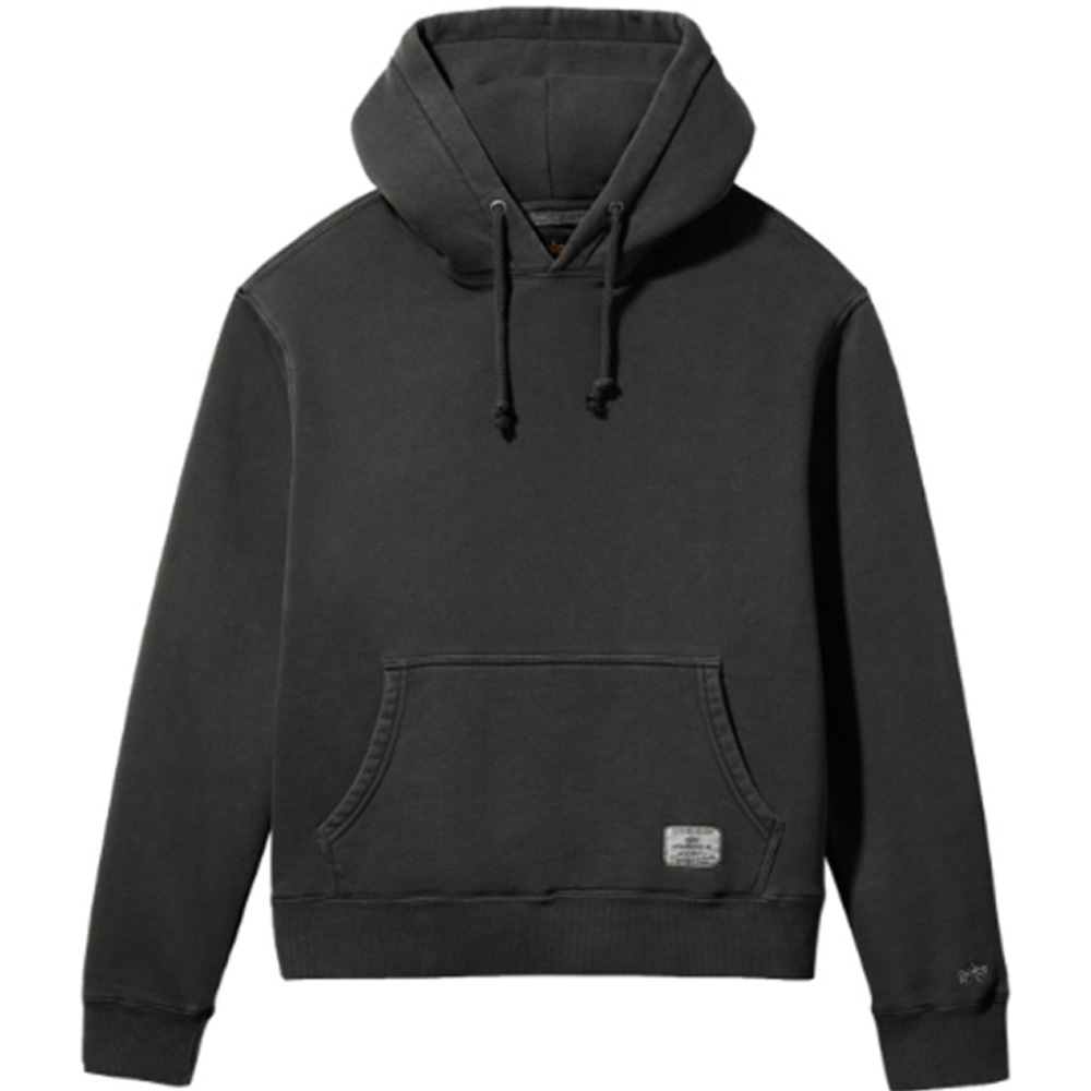 A basic, unisex hoodie with garment wash and Alpha Industries logo on the sleeve.