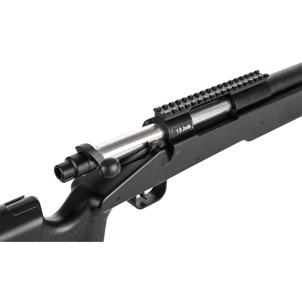 Hit all your targets with the M40A3 Spring Airsoft Rifle. A 1:1 scale replica of the trusted sniper platform used by the United States Marine Corps, this bolt-action rifle is designed for top accuracy and power. Features include an adjustable cheek rest for comfort, an accessory top rail for mounting scopes, and textured grip areas for improved handling. This airsoft sniper rifle has a matte black polymer frame, a bolt-action spring firing system, and a full-metal barrel/bolt assembly.