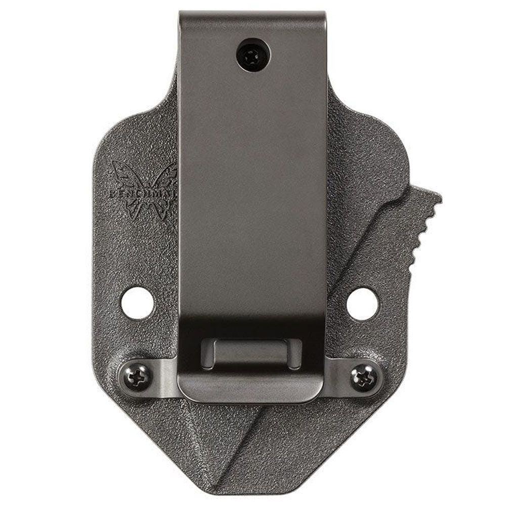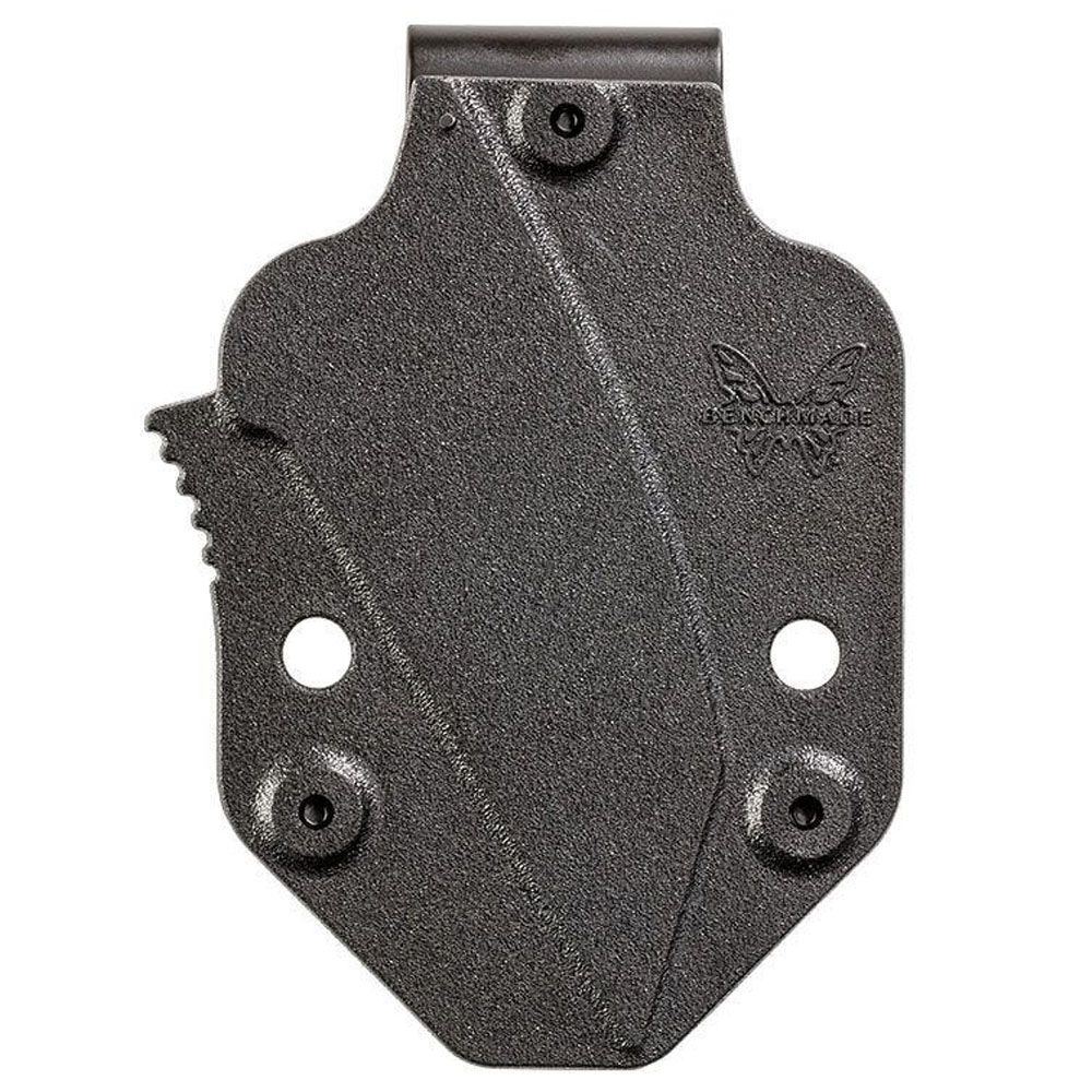 The Benchmade Azeria fixed blade features a wharncliffe style N680 steel blade in a black finish. Its handle is fitted with textured Grivory scales and a convenient lanyard hole that promotes quick deployment and ample dexterity. The knife also features a deep notched jimping in combination with a comfortable finger groove that simply adds to grip security and blade control. Included is also a low-profile molded sheath with ambidextrous clip, designed for duty belts.