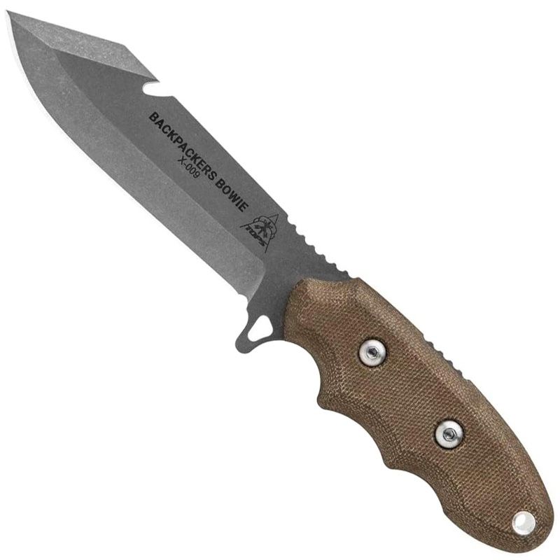 One of the most important items in any backpacker's bag is a blade. Some backpackers put a high priority on having bladed tools and others not so high, but almost all carry some type of knife. TOPS set out to make a Bowie knife that would meet the needs of the guys that want a knife that will not fail them, but without adding a lot of weight to their loadout. The result is a 4” blade that could be the most important piece that goes on the backpacking trip. Aside from the normal uses a knife affords, the notch on the spine is for breaking wire or pulling a pot out of the fire and the swedge can be sharpened upon request. The full, rounded handles provide a comfortable grip whether you're exhausted from walking all day or you're lounging around the campsite. The Kydex sheath has a rotating clip so that it can be worn on the belt or clipped to a pack rather than taking up important space inside of it.