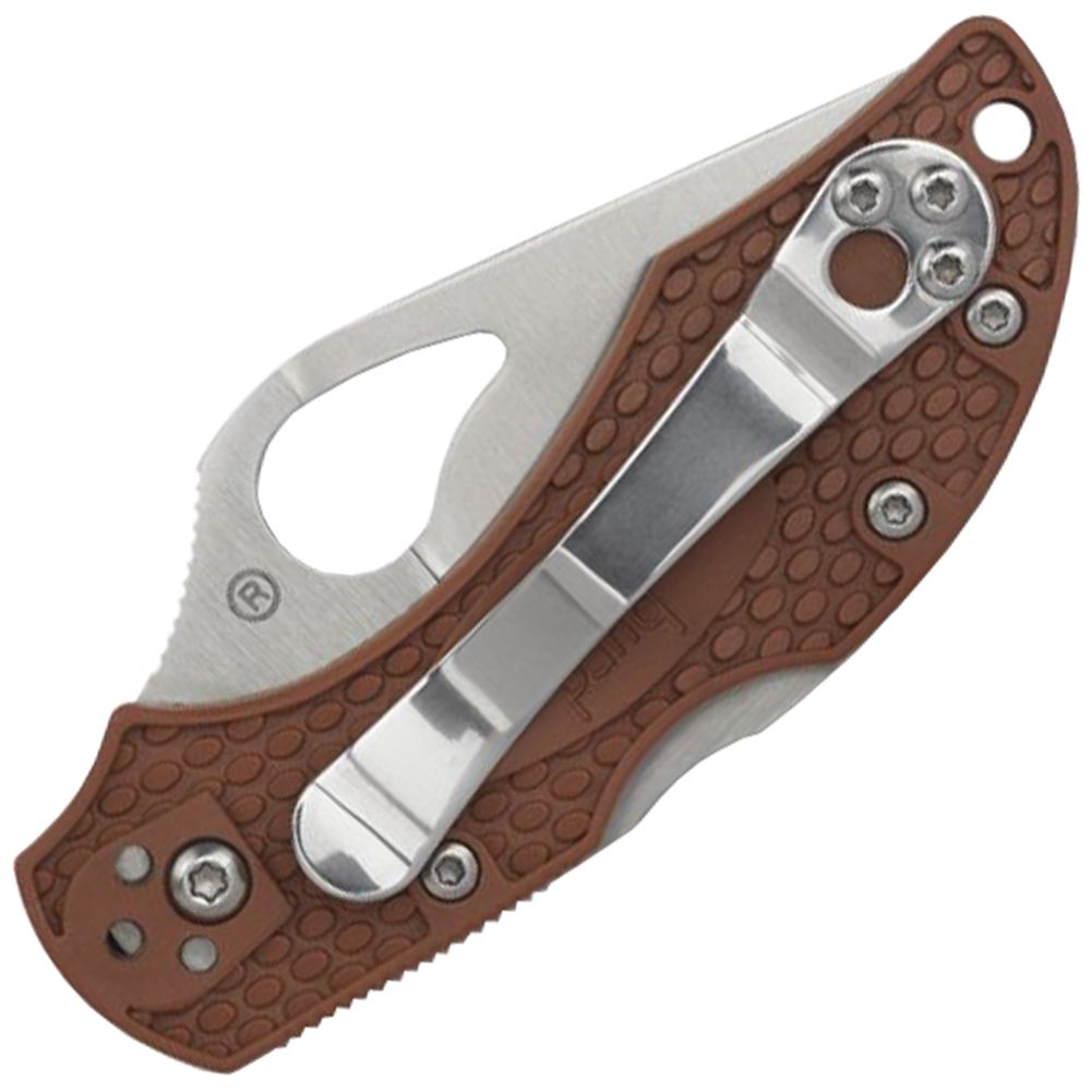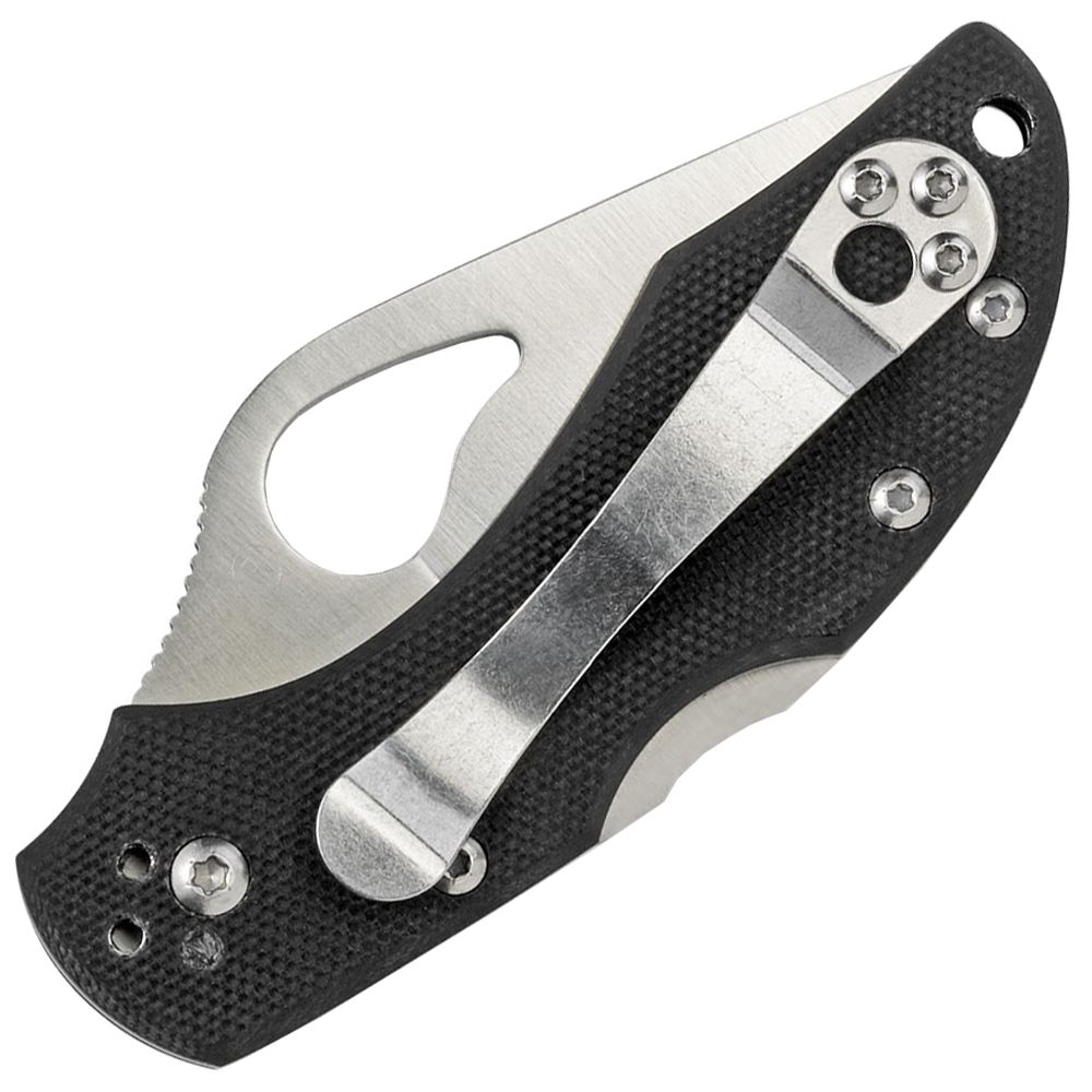 The handle is made of a front and back G-10 scale set over a stainless liner. G-10 is an epoxy-filled laminate with a weave-texture similar to cloth. It provides secure and steady grip when cutting, resists chemicals, oil and temperature extremes. The welcome addition of a four-way clip offers the option of carrying the folder tip-up/tip-down or left-right-handed and a lanyard hole located at the back of the handle accommodates a secondary-retentive thong or cord.