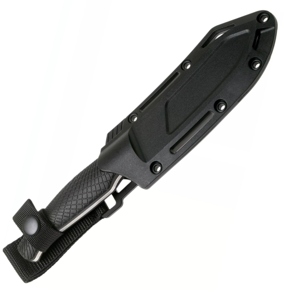 The Camp 5 is perfect for survival, camping, bushcraft or backpacking. It features a large Bowie-style blade, made of tough premium D2 steel in a stonewash finish that can tackle almost anything from broad chopping to fine slicing. The glass-filled nylon handle has been machined with a pattern designed as well to grip your hand like gloves. The knife is presented with Black Molded Belt Sheath with dual-retention system and easy tab release.