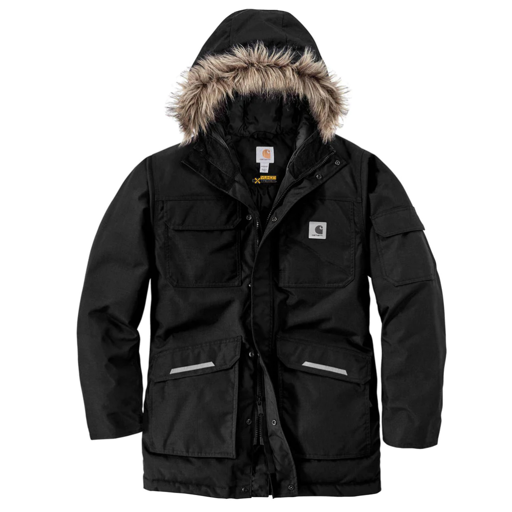 6.5-ounce, 500-denier Cordura® nylon shell. 390g 3M™ Thinsulate™ 700-fill featherless down insulation. 3M™ Scotchlite™ Carbon Black reflective taping on center back, front pockets, and back of cuffs. Wind Fighter® technology tames the wind. Rain Defender® durable water repellent (DWR). Triple-stitched main seams. Detachable faux fur hood. Two-way center front zipper with storm flap with snap closure. Rib-knit storm cuffs with hook-and-loop adjustment. 3M™ reflective Carhartt patch. Left-chest zip map pocket; Right-chest snap-button pocket. Hook-and-loop sleeve pocket. Two lower-front hook-and-loop pockets with side zips. Back zip pocket; Inner zip and hook-and-loop pockets