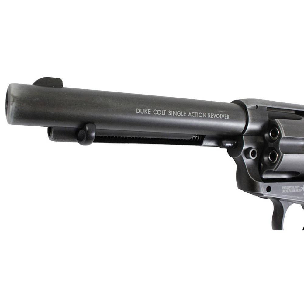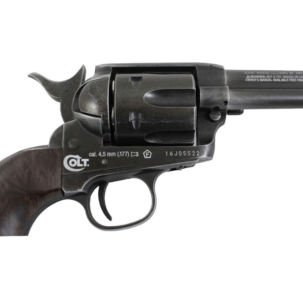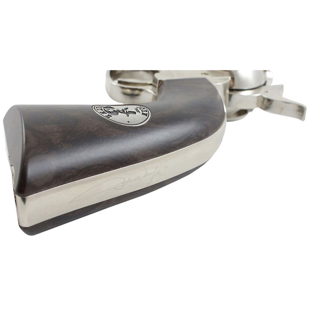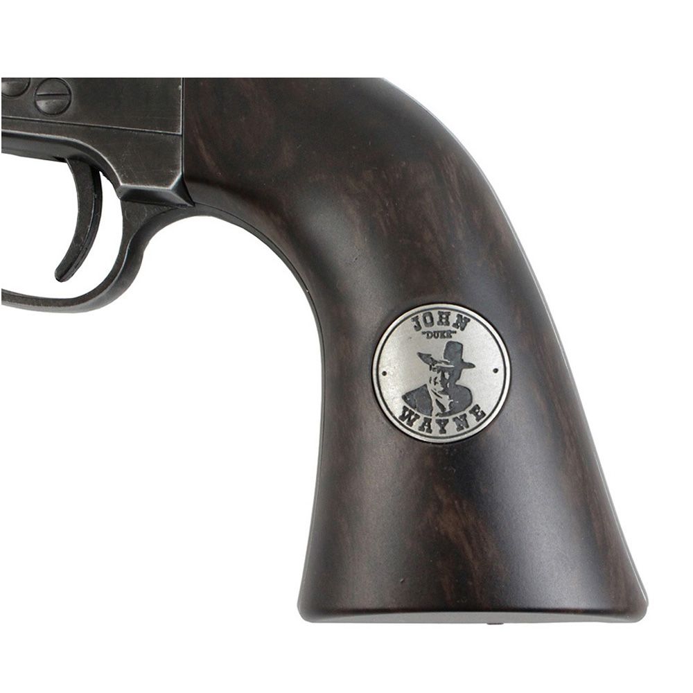 Inspired by the man, the legend, the Duke—these John Wayne signature Colt Single Action Pellet Revolvers are made for a quick-draw and sharp shooting. Constructed with a full metal frame and available with a nickel silver or weathered gunmetal finish, the gun features fully licensed John Wayne and Colt engravings. Just like a real steel Colt .45 SAA, this pellet revolver has a functional cylinder, ejector rod, and loading gate that uses realistic rear-loading shells. This pellet model has a rifled barrel that improves accuracy and provides an authentic revolver firing experience.