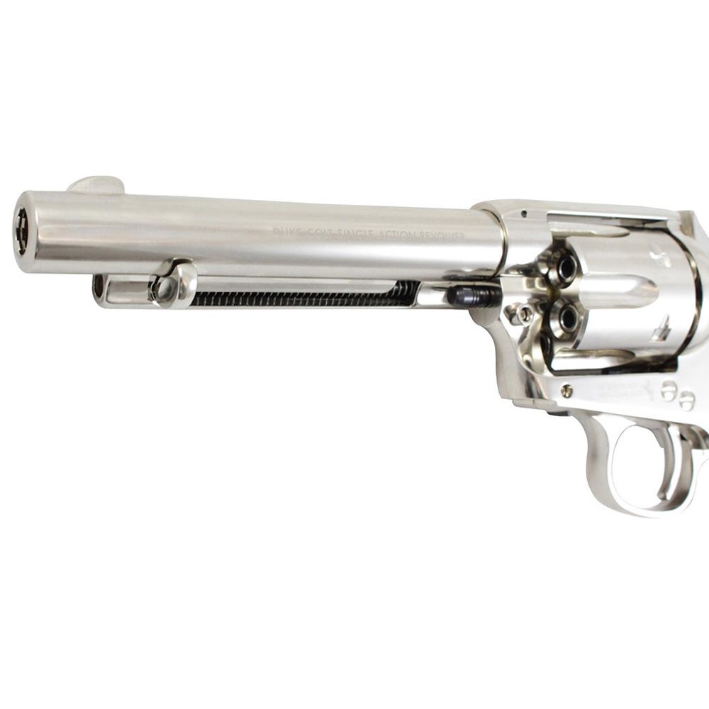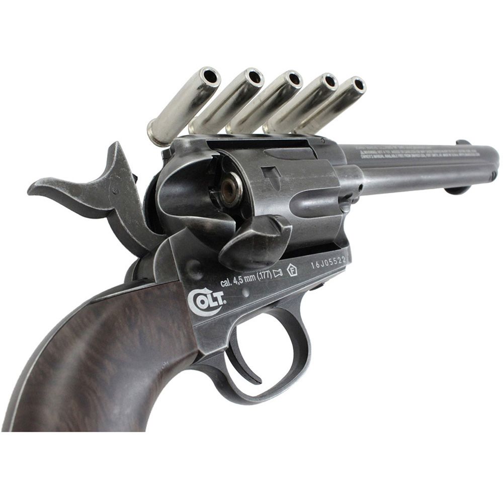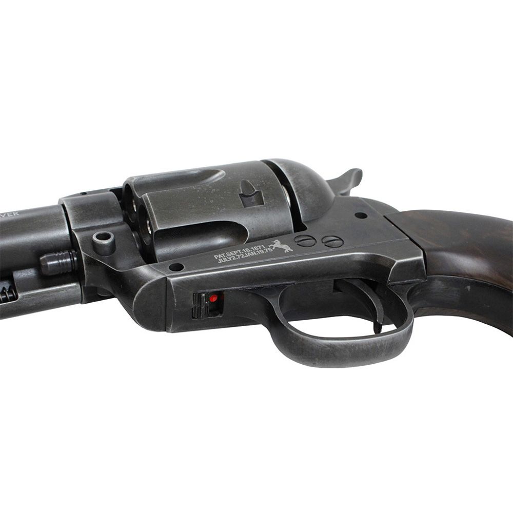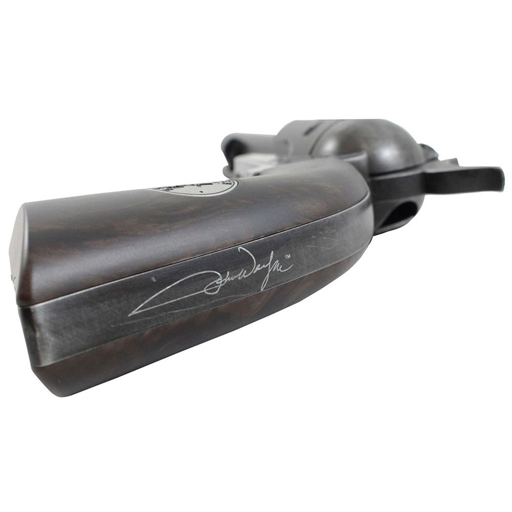 Inspired by the man, the legend, the Duke—these John Wayne signature Colt Single Action Pellet Revolvers are made for a quick-draw and sharp shooting. Constructed with a full metal frame and available with a nickel silver or weathered gunmetal finish, the gun features fully licensed John Wayne and Colt engravings. Just like a real steel Colt .45 SAA, this pellet revolver has a functional cylinder, ejector rod, and loading gate that uses realistic rear-loading shells. This pellet model has a rifled barrel that improves accuracy and provides an authentic revolver firing experience.