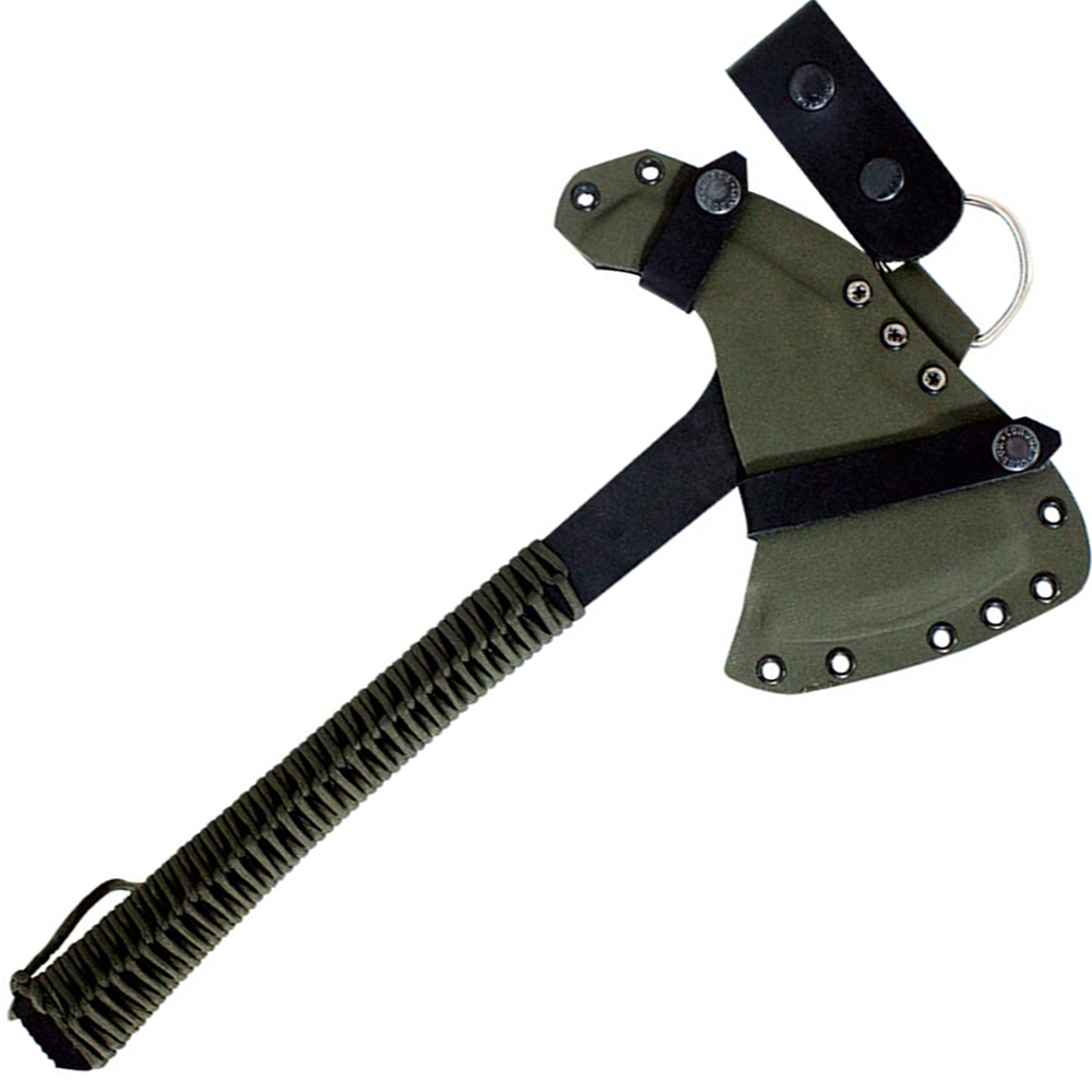 The Condor Sentine Army Green - Axe is built for durability and survival in demanding conditions. Its axe head is forged from 1075 high carbon steel, heat treated to 50–55 Rockwell hardness, and finished with black traction powder coating for added protection. The handle is wrapped in real 550 lb test parachute cord, offering strength and emergency versatility with its seven inner strands that can be repurposed for fishing, sewing, or tying. A rugged Kydex sheath with leather belt loop, designed by 710 Custom Sheaths, ensures safe carry and quick access.