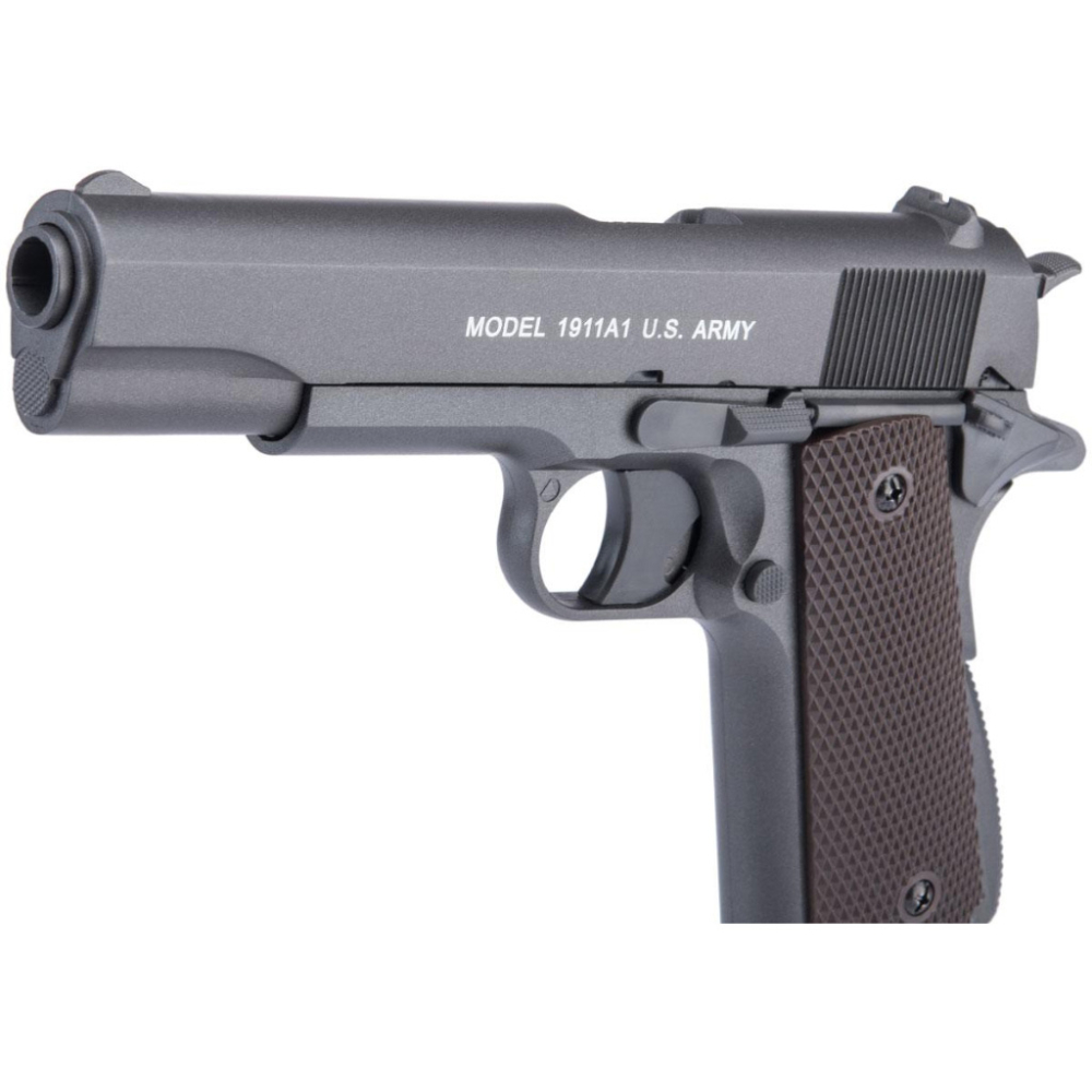 This one will have a real place in the windows of collectors with its parallel realism to the real steel. The hefty metal slide bores the authentic Auto Ordnance licensing and what really takes it to whole new level is its double rotating chamber of 6 rounds of ammunition. It is a clever little mechanic that has a black head equipped with a first small barrel with a capacity of 6 leads 4.5 mm. Once it is filled, the piece is turned over to make appear the second barrel of 6 units that will have to be completed identically. The whole is made of synthetic material and aluminum alloy (cylinder head) with fine black sandblasting, so homogeneous that one cannot distinguish with the naked eye what is metallic from what is not.