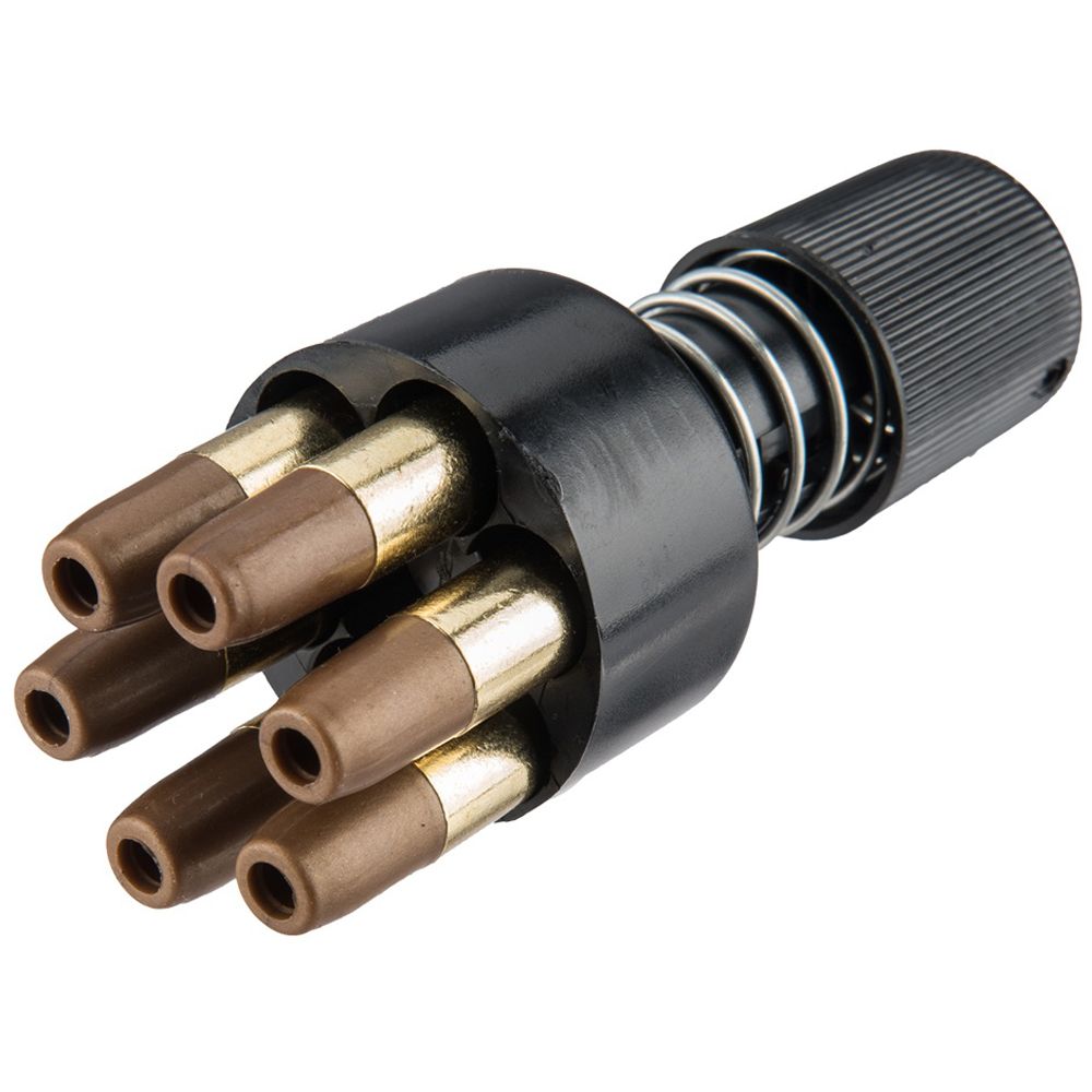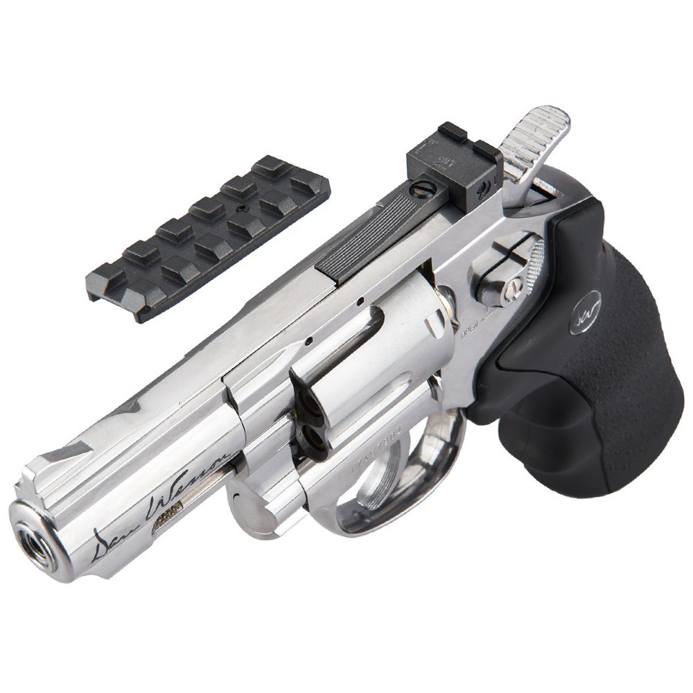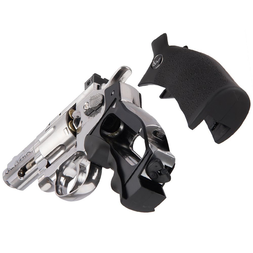 This 2.5" barrel, 4.5mm caliber version of the legendary Dan Wesson revolver comes with fully licensed DW markings and an individual serial number. The revolver has a double action trigger system and adjustable rear sight for extra realism. Even the shells have received the "Dan Wesson" stamp of approval. This extremely realistic airgun has a full metal construction with a mirror silver finish and a fully functional cylinder. It comes with an accessory rail so you can attach various accessories like a laser sight or pistol scope. The package includes six cartridges and a revolver speedloader.