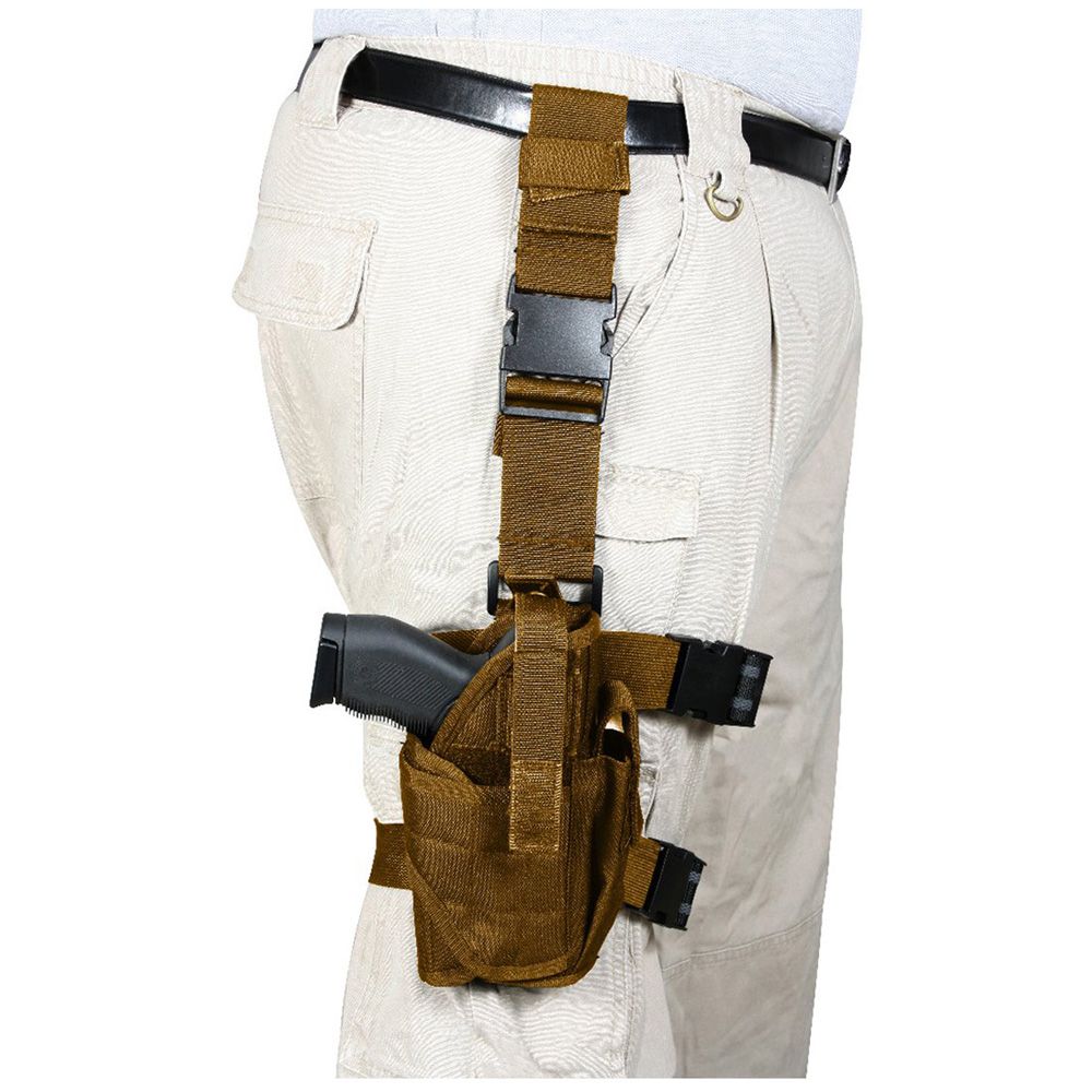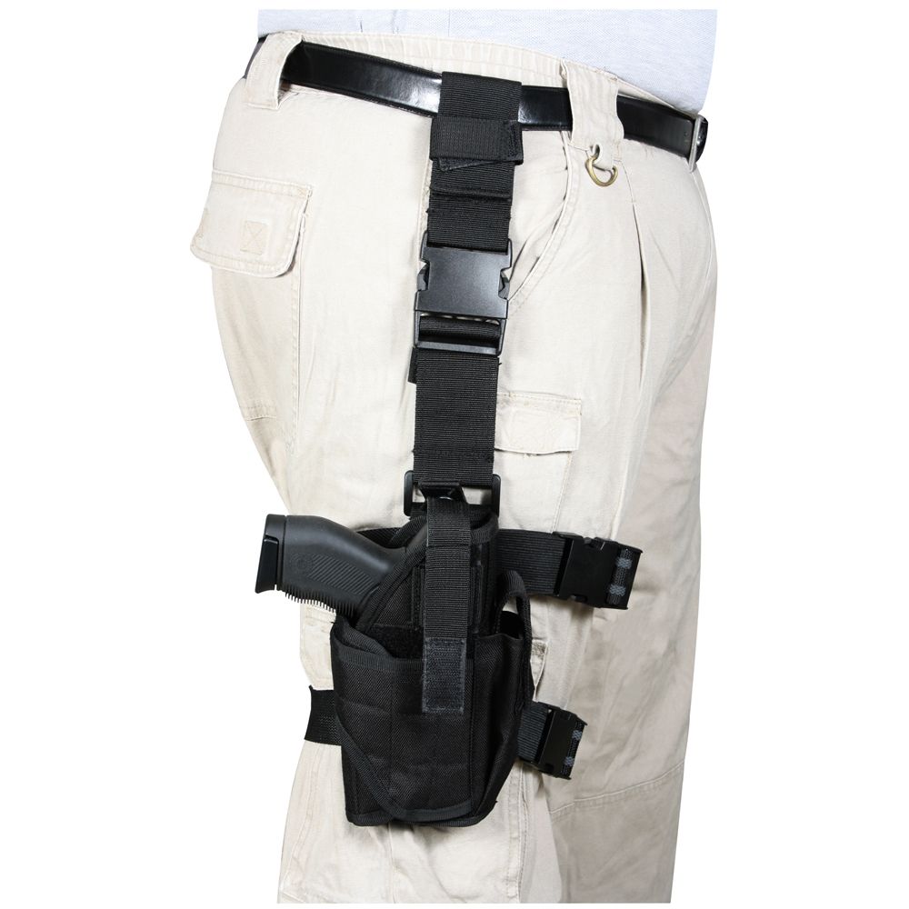 Deluxe Adjustable Drop Leg Tactical Holster Accepts Most Size Frames Dual Adjustable Leg Straps With Quick Release Buckles Quick Release Belt Clip Adjustable Thumb Snap Clip Pouch Poly Webbing. version features 1000D Cordura Nylon Fabric Is U.S. Made & Provided By , Fabric Is Licensed Through Crye Industries.