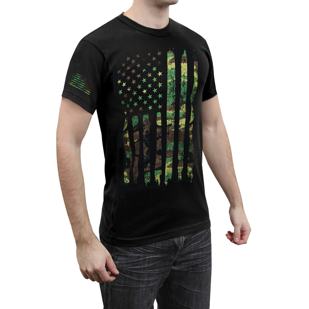 - Smaller US Flag On The Right Sleeve Of The American Flag T-Shirt Is Oriented With The Stars Facing Forward To Represent A Flag Flying In The Breeze While The Wearer Moves Forward, Just Like On A Real Military Uniform