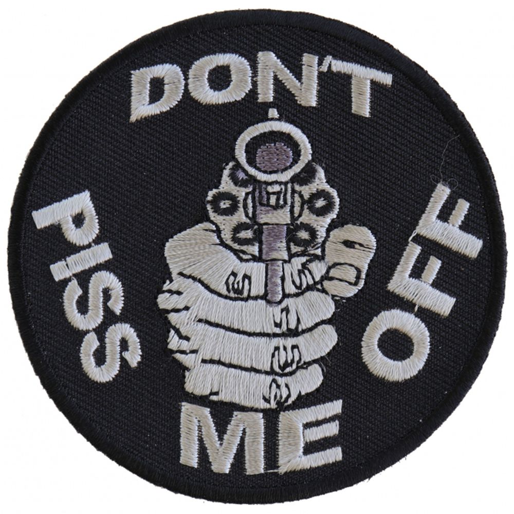 Don't piss me off patch is embroidered and 3 inches round. With a gun right in the center. Clear message. Just don't piss me off!