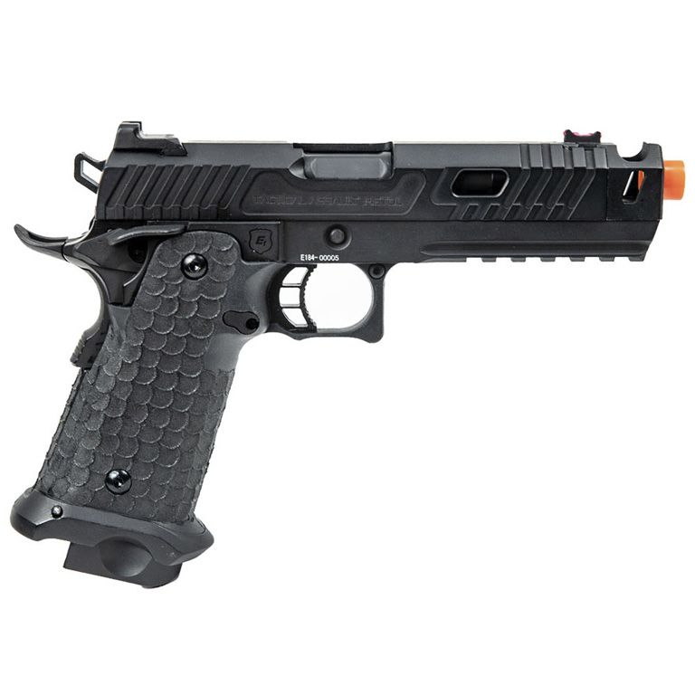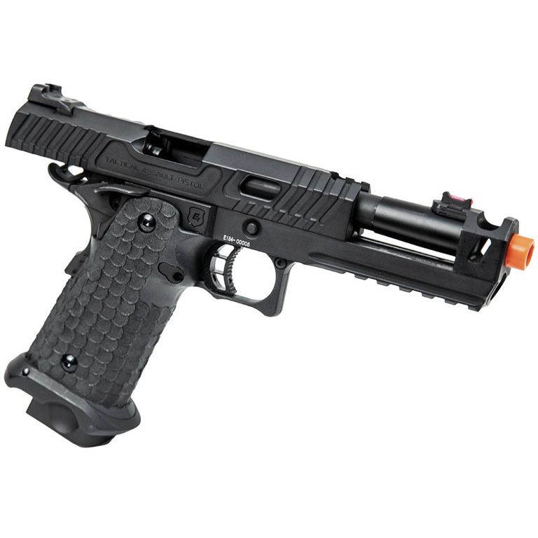 The Tactical Assault Pistol is one of Echo1's latest addition to their Gas Blowback collections. The slide and the compensator combo help maximize performance as the slide lightening cuts have been made to reduce the weight of the slide for faster follow up shots. The ultra-cool ergonomic design is made with a texturized polymer to allow for firm hand grips. This gas-powered Echo1 gun gives a satisfying blowback at 310-366fps and 29 rounds capacity in a magazine. A magazine well is found at the base of the grip that will assist shooters with lightning-fast reloads.