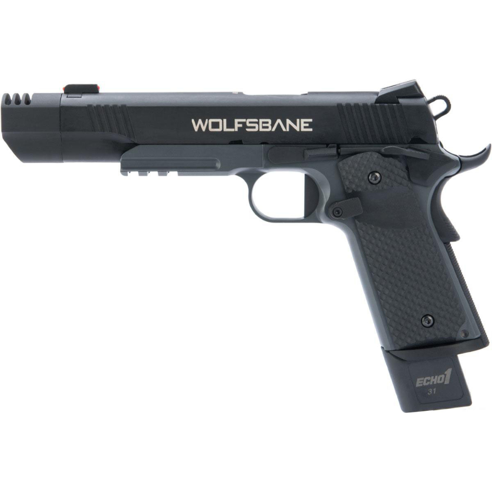 The Echo 1 Wolfsbane series is one of the most combat ready 1911s available in the airsoft market. Out of the box, this airsoft pistol includes a 30 round magazine providing plenty of fire power to annihilate your targets. The aggressive pistol panels come textured for a very positive grip. The cut channel on the left panel also allows for easy access to the extended magazine release while the front fiber optic helps in quick target acquisition. With the threaded barrel adapter you can equally add a mock suppressor, amplifier, or tracer unit or simply install the included compensator for bad ass look! As added bonus is also a rail mount.