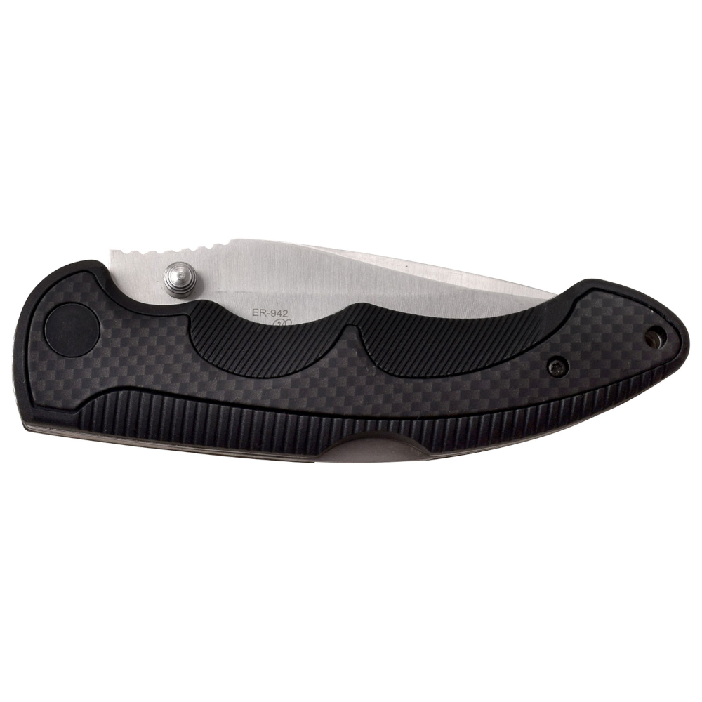 The handle is crafted from injection-molded nylon fiber with an aluminum overlay, providing a comfortable and secure grip. The knife includes a nylon pouch for convenient storage and transport.