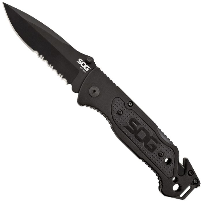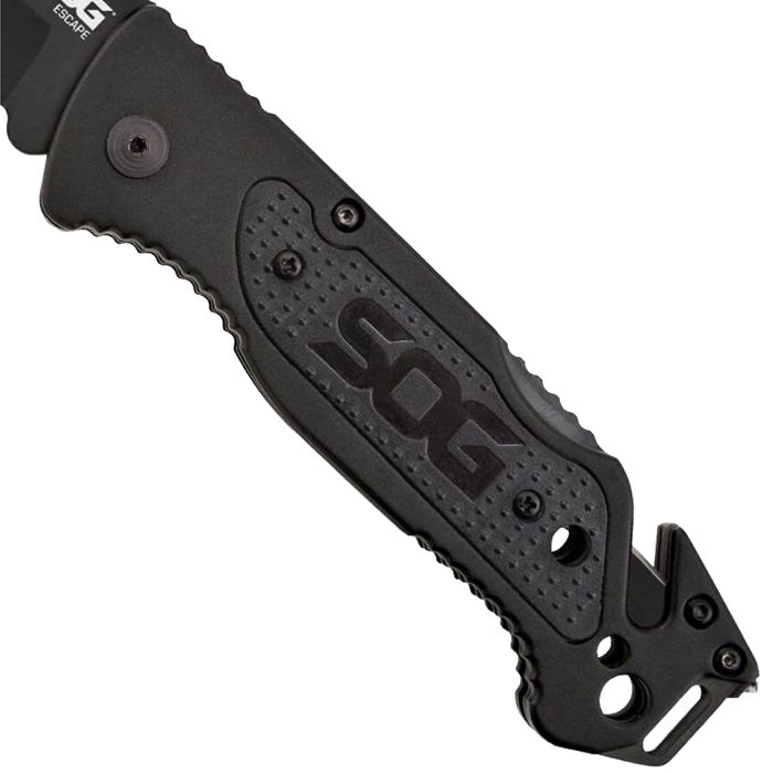 Don't know about you, but the world seems to be getting more complicated. The Escape acknowledges this and provides a solution for you. As a general knife, it is the perfect size for everyday carry but still has a tremendous amount of capability with its one hand-opening blade. Integrated in the handle is a line cutter (perfect for cutting cord, string, seat belts, etc.), a glass breaker for extreme emergencies, our patent-pending wire stripper, and extra line cutter blades (which are stored under the handle slab). All this combined with a stout partially serrated spear point blade and hard anodized aluminum handle, says I'm ready for whatever might come my way.