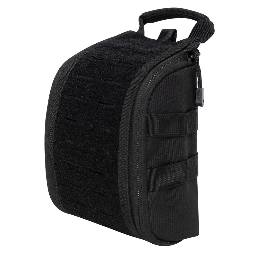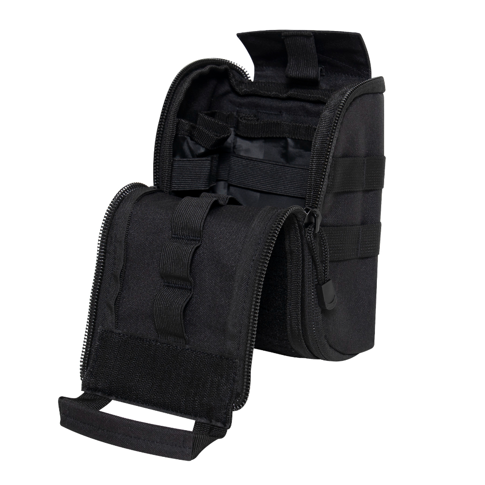 Fast Action MOLLE Medical Pouch is a necessity for field medics and first responders with over 15 storage compartments for holding life-saving gear. Simply pull down on the grip handle for rapid access to your medical equipment. Simply pull down on the grip handle for rapid access to your medical gear. The medical pouch features four inner pockets for storing large gear in addition to 13 elastic bands for storing smaller items. The outside front of the medical pouch features a MOLLE compatible loop field for additional attachments. The MOLLE pouch features a dual zipper closure for easy access to all of your gear. The MOLLE attachment is perfect for mounting on tactical vests, assault packs, and drop leg panels. Measures 23 inches x 7.5 inches x 13 inches while open, and 9.5 inches x 7 inches x 3 inches when closed.