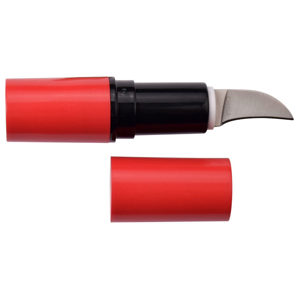 Introducing the Femme Fatale Fixed Blade Lipstick Knife, a discreet and stylish self-defense tool designed for everyday carry. This unique knife features a 2.75" overall length with a 1" hawkbill blade, cleverly concealed within an injection-molded lipstick handle.