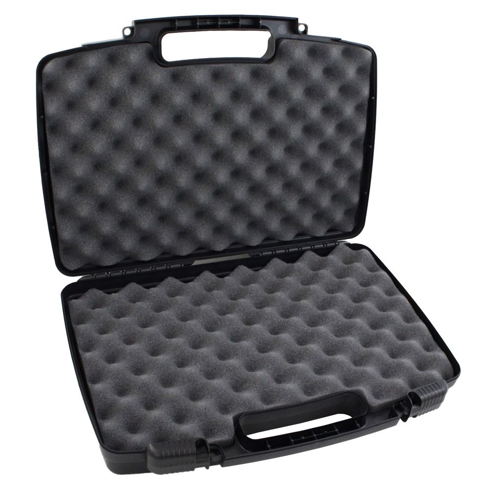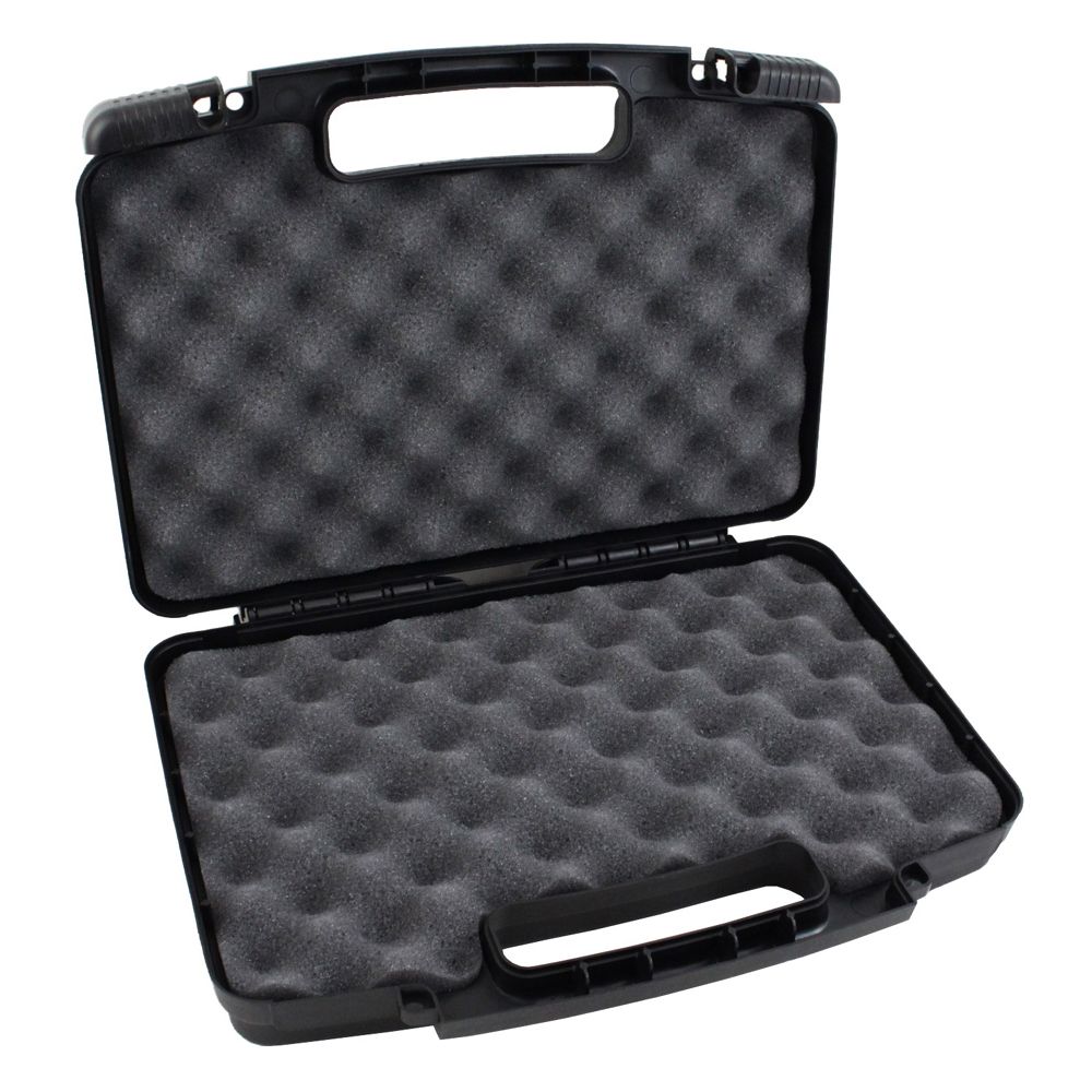 The Flambeau Safe Shot Pistol Case keeps your guns safe and secure for transportation and home storage. Built from durable polymer with a corugated-foam-lined compartment that can fit most revolveres, pistols, and spare magazines. The sliding latches are padlock compatible and comply with TSA airline safety requirements.