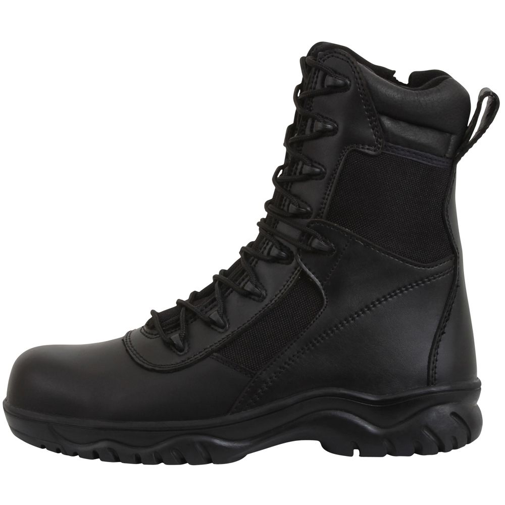 Tactical boot with side zipper for men is offered in a non-metallic version. This security-friendly boot offers enhanced warmth and safety as it is non-conductive. Some of the features offered with this Forced Entry composite toe tactical boot include the slip-resistant sole, gusseted tongue and nylon and leather upper. The boot features a moisture-wicking lining that helps keep the feet warm and dry. Other salient features of the boot include the speed lace eyelets and strong shank and composite toe. This tactical boot is perfect for those who need to be on their feet for long hours. The comfortable boot offers enhanced ankle support and is very comfortable to wear and walk around.