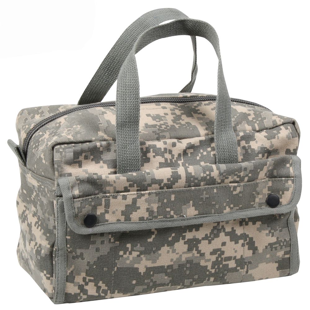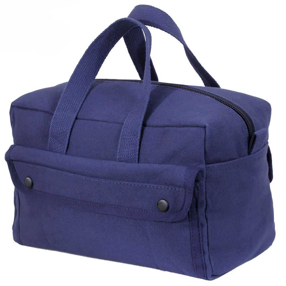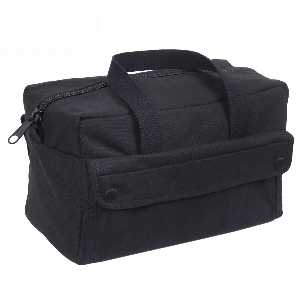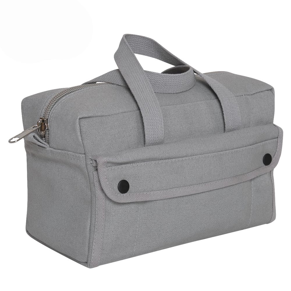 G.I. Type Mechanics Tool Bags feature a heavyweight Cotton Canvas material with 2 outside snap pockets, 8 inside tool organizer pockets and Nylon zipper. Overall dimensions are 11" x 7" x 6".