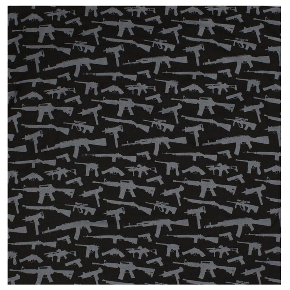 Guns And Rifles Pattern Bandana is made of 100% cotton. The pattern is quite exclusive. It measures 22 inches X 22 inches. It is sewn on all four sides. It is unisex; it can be used by both men and women. It can be folded into any shape so that it can be used in numerous ways. It is mainly used as head band and wrist band. As it is made of 100% cotton, it can be used as sweat band also.