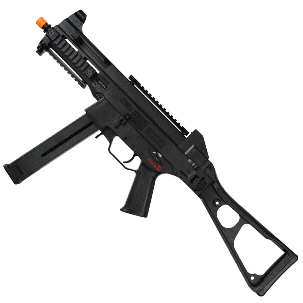 The Competition Series HK UMP Airsoft Rifle offers a full metal gearbox and gears with a reinforced ABS body. The High capacity 400 round magazine allows for lots of firing between reloads. The UMP gives you the ability to fold the stock, adjust the rear sight, and easily switch between full and semi-automatic. This is an Officially licensed replica! Accept no imitations! Licensed Trademark of Heckler & Koch GmbH