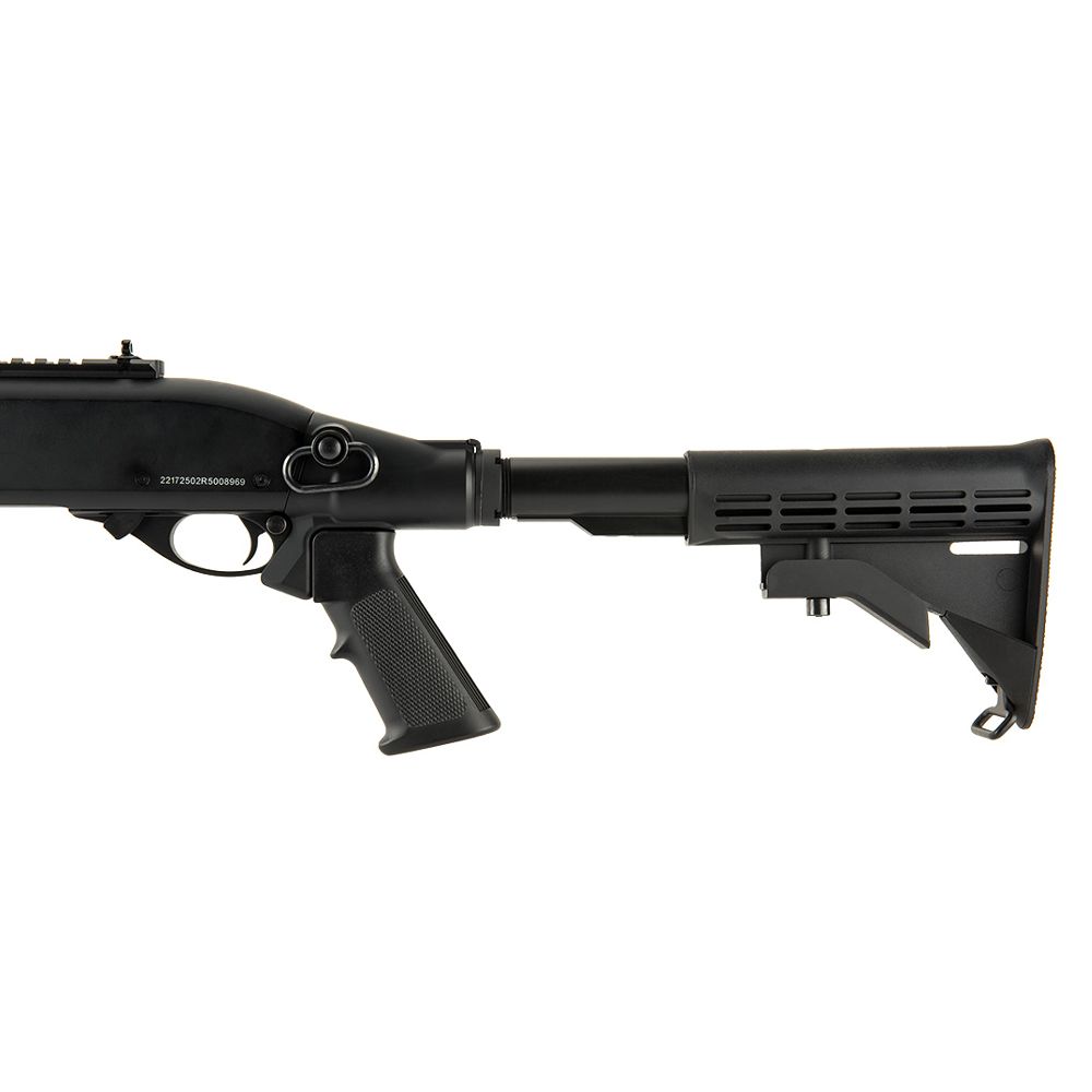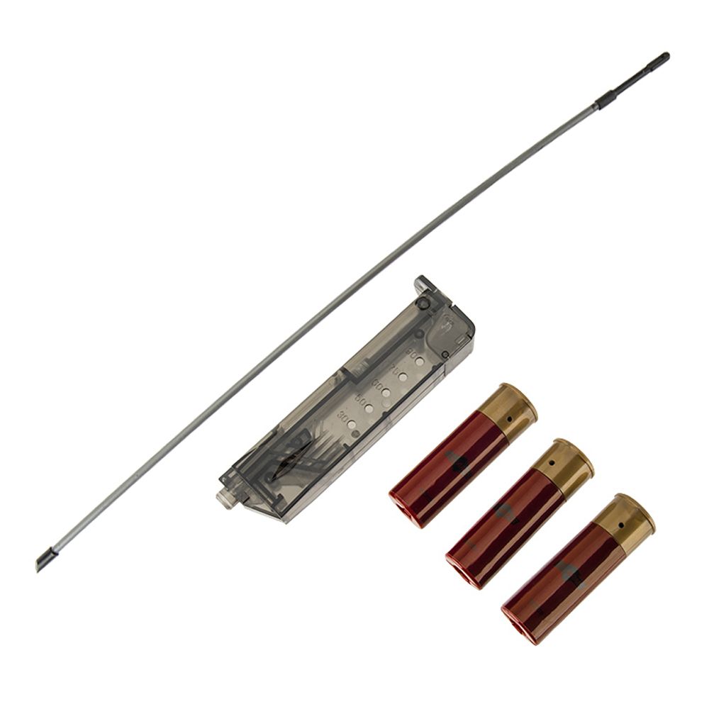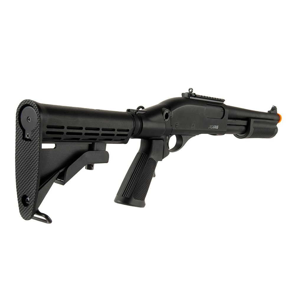 The wait for reliable and affordable gas shotgun is over; featuring JAG Arms Scattergun Gas Shotgun Series. TS Series features a M4 Style adapter with collapsable stock. The buffer tube also acts as the green gas reservoir which can approximately hold 110 shots per fill (shot per fill will vary on weather, shooting practice, and # of rounds per shot used). TS series also features a more traditional pistol grip; much like found on most common AR15/M4 rifles. This shotgun is constructed with a full metal receiver which also houses the standard m1913 Picatinny top rail to mount any optic. Under the metal barrel are 3 inner barrels with fixed hop up which allows the users to switch from 3 rounds or 6 rounds per shot by a flick of a lever located inside the ejection port.