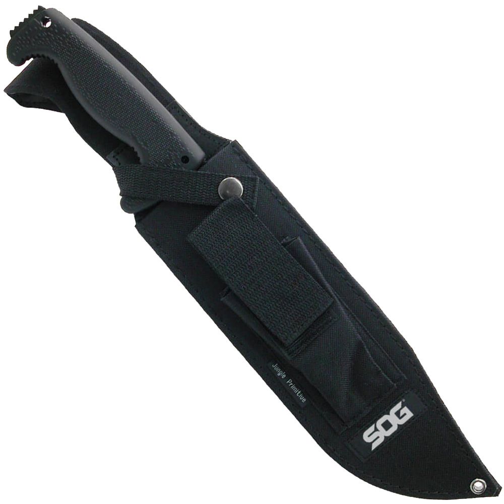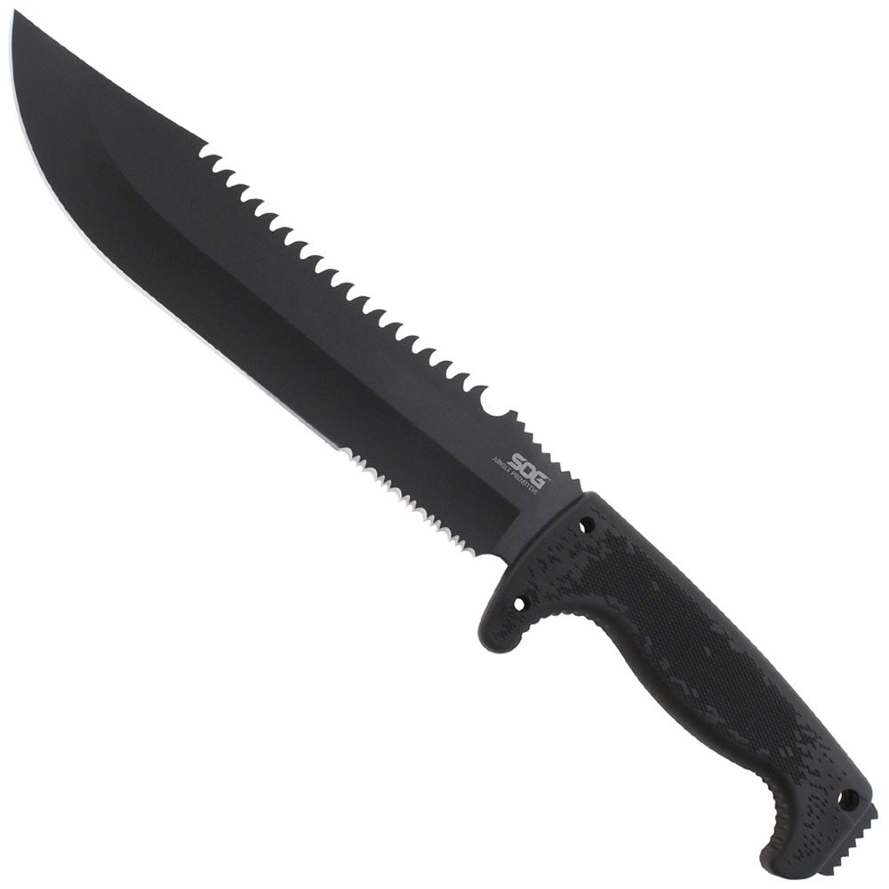 For the primitive in all of us. When the only thing that separates you from them is your equipment, it better be good. Using SOG's Hardcased black coating, the Jungle Primitive is durable and comfortable with a molded Kraton handle that features Digi-Grip, a way to guarantee gripping power where you need it. One can instantly turn the Primitive into a small machete, limb saw, or hammer. Includes a Nylon sheath with a utility pouch. Don't be caught alone!