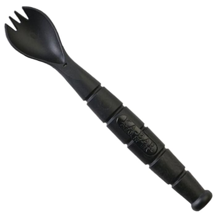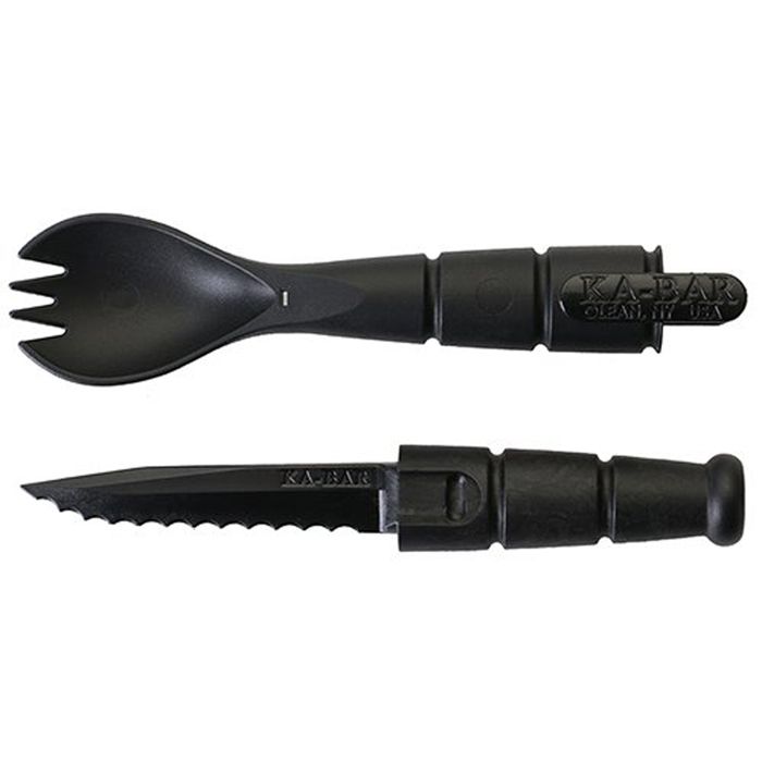 The KA-BAR Spork, which is made from food and water approved Grilamid, is equipped with a fork/spoon combo and has a 2.5" plastic serrated knife in the handle. The knife is accessed by pulling the spork in opposite directions from each extreme end. Hint--avoid gripping the flat panel area in the middle of the Spork--this is actually part of its lock. The tighter you hold here, the more difficult it will be for you to pull out the knife! The Spork is 6.875" overall and has a blade length of 2.5". It weighs 0.1 lb.