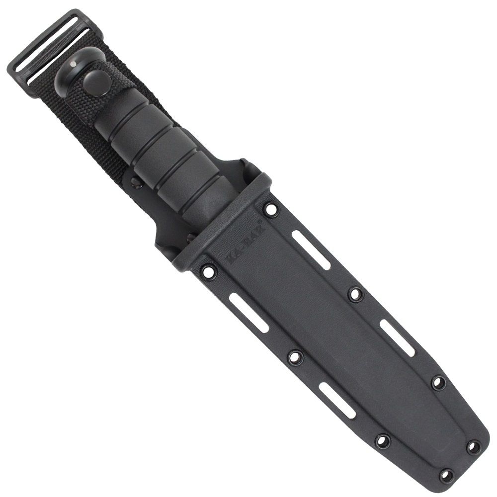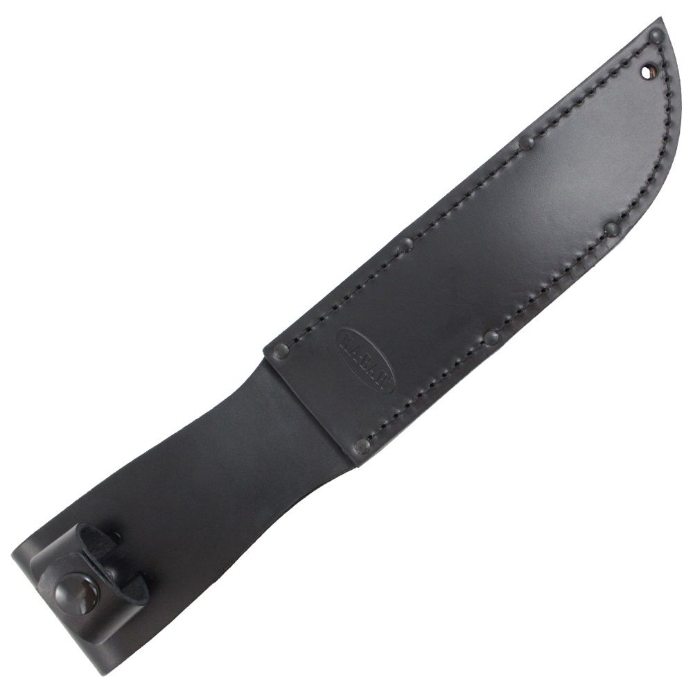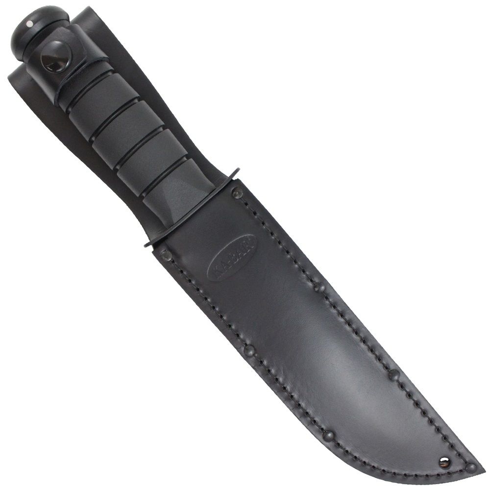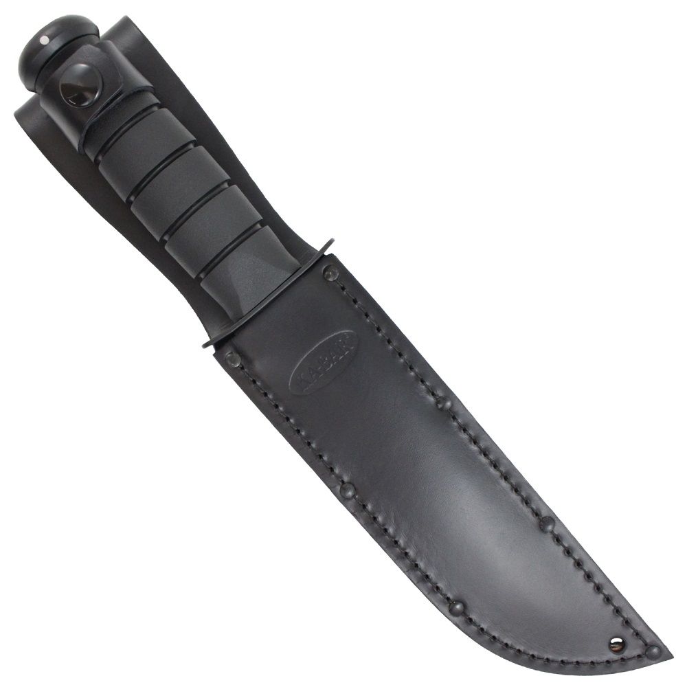 The classic Ka-Bar Combat Knife has received a modern tactical makeover. This fixed blade knife features the iconic Ka-Bar clip point blade and blood groove with a black powder finish. It comes available with a plain edge for clean slicing or combo serrated edge for sawing through rough and fibrous materials. The oval-shaped Kraton handle has a ribbed texture for extra grip and control. The black finish continues along the double guard and 12GA carbon steel butt cap. Strap it to you bag or belt with the included sheath, available in black leather or MOLLE compatible hard plastic.