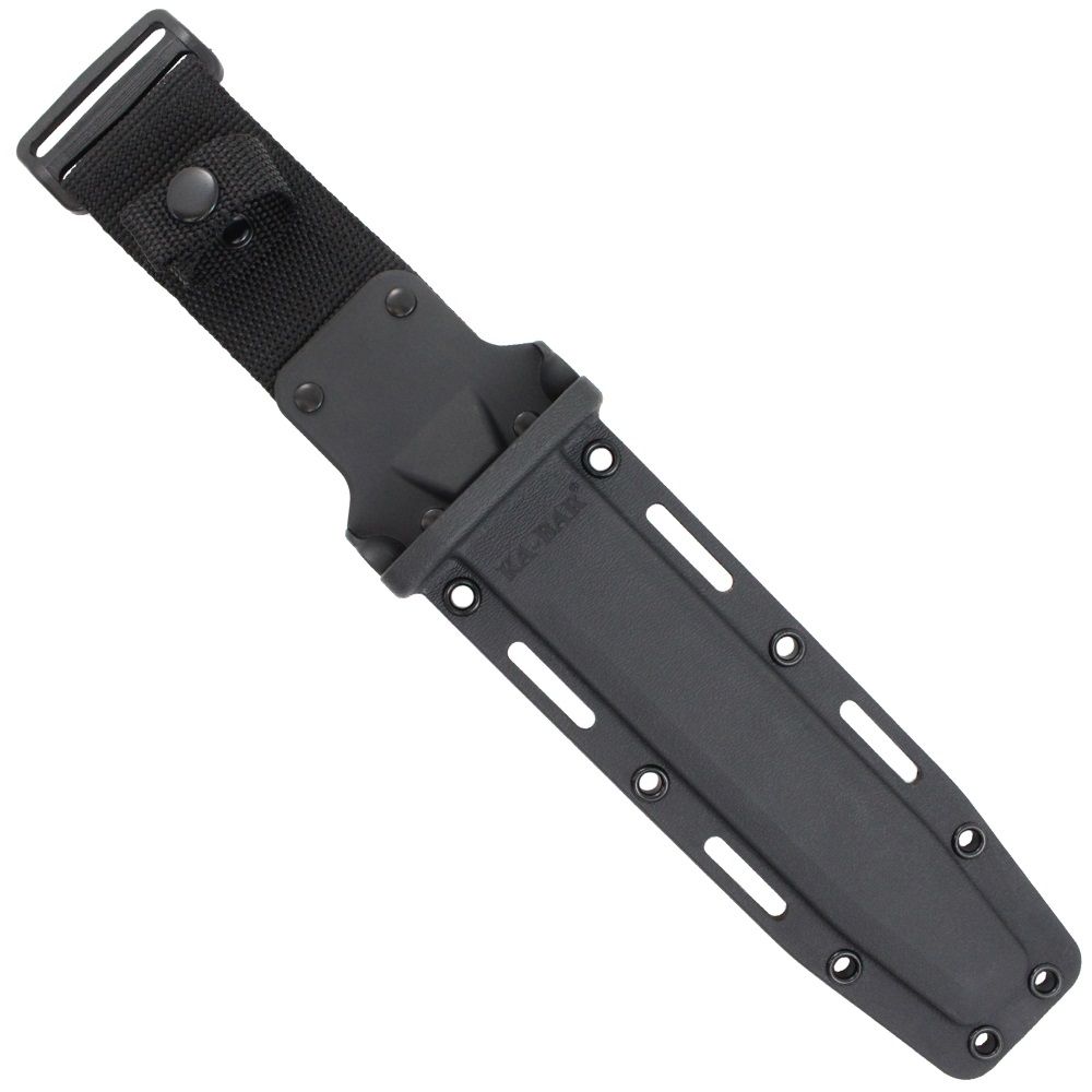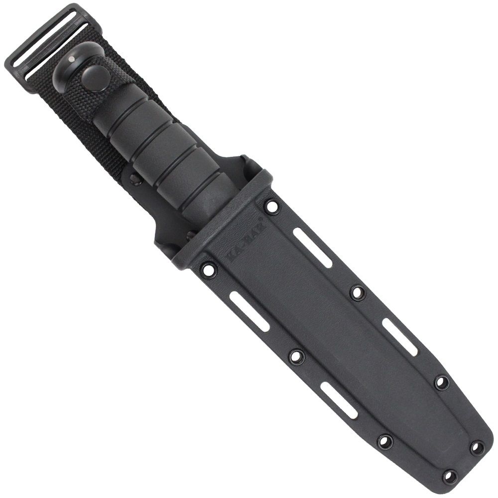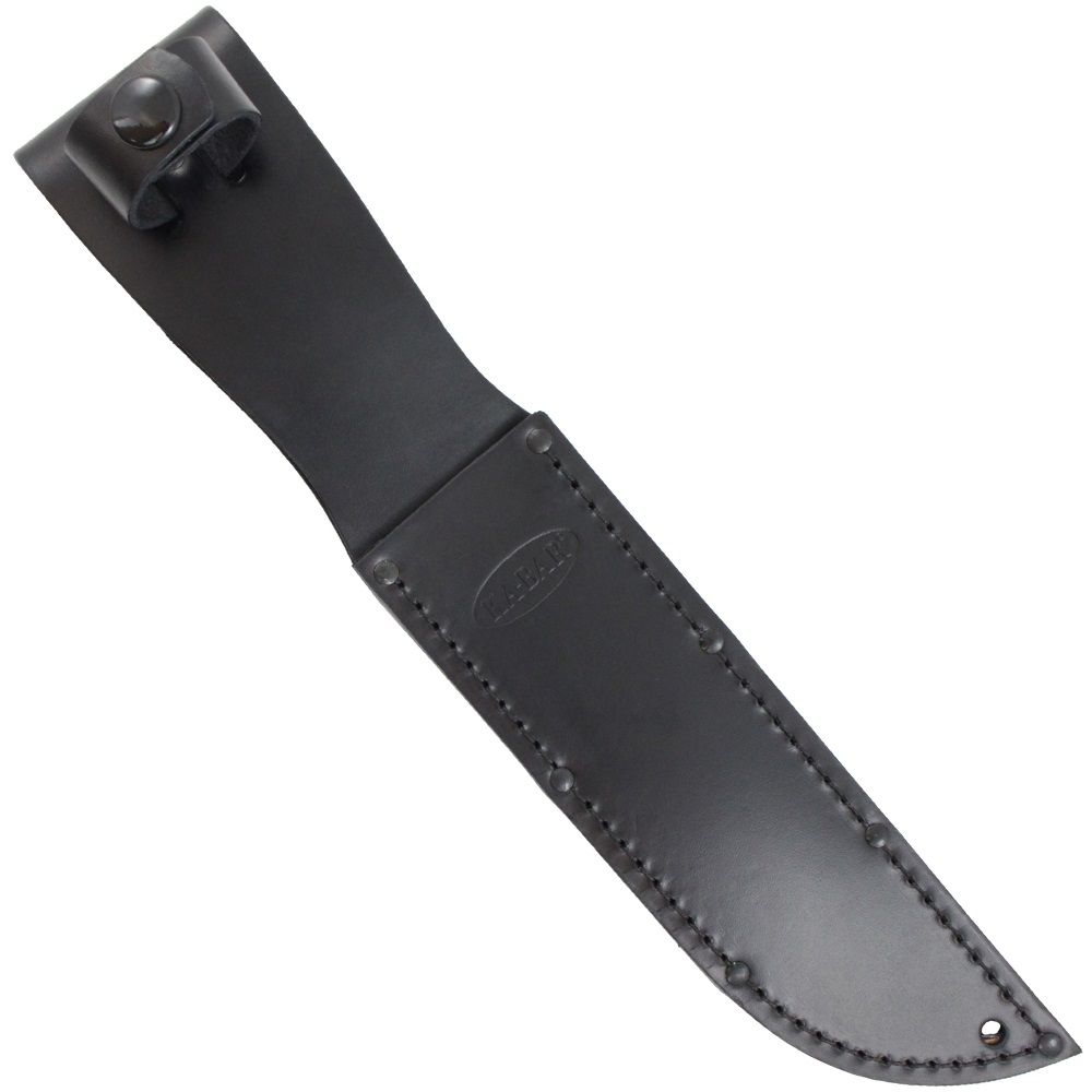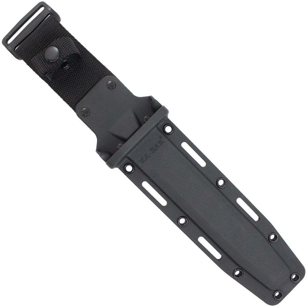 The classic Ka-Bar Combat Knife has received a modern tactical makeover. This fixed blade knife features the iconic Ka-Bar clip point blade and blood groove with a black powder finish. It comes available with a plain edge for clean slicing or combo serrated edge for sawing through rough and fibrous materials. The oval-shaped Kraton handle has a ribbed texture for extra grip and control. The black finish continues along the double guard and 12GA carbon steel butt cap. Strap it to you bag or belt with the included sheath, available in black leather or MOLLE compatible hard plastic.