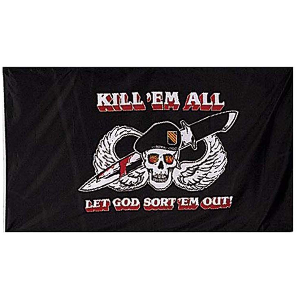 The Kill Em All Flag is a great way to depict your warrior spirit. This black flag has “Kill Em All LET GOD SORT ‘EM OUT” printed on 3-d effect white and red letters in bold robust design. The printed white logo has a skull with a blooded knife through it and beret. Ultra force has employed their best craftsmen in fabricating this Kill Em All Flag. The crafts men are one of the leading professionals in their field and they have applied their years of knowledge in weaving this polyester flag; this is why this flag is so unique in terms of durability and commercial quality.