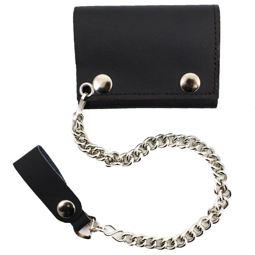 Carry your hard earned cash in style with the Leather Tri-Fold Pocket Wallet. This tough biker wallet comes with six clear slots for IDs and pictures, a slot for paper money, and two credit card slots. The removable metal chain clips onto belt and bag loops for easy carry. Made in the USA.