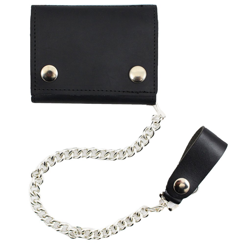 Keep your bills looking fresh with the Leather Tri-Fold Wallet. This high quality billfold has multiple interior compartments to keep credit cards, paper money, pictures, IDs, and loose change organized. The black leather wallet secures with two metal snaps and comes with a removable metal chain. Made in the USA.