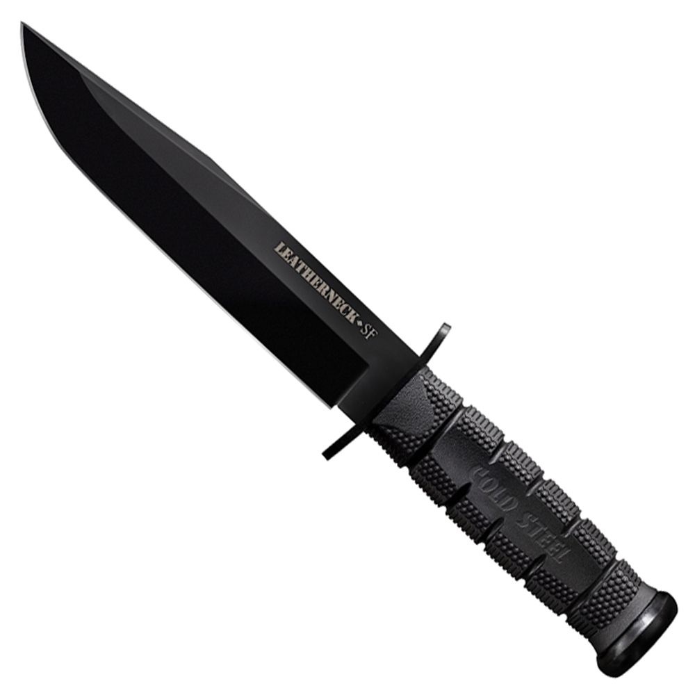 The Cold Steel Leatherneck Series is comprised of two distinct and iconic blade styles, both of which have proven to be exceptionally popular with our brothers and sisters in the armed forces: The Leatherneck-SF (for Semper-Fi) has a beautiful hand honed saber ground clip point blade, and the Leatherneck Tanto features our signature Cold Steel “American Tanto” blade with a stout reinforced tip for extra strength. Both are made from tough D2 Tool Steel with a non-reflective black powder coat finish. To keep the user’s fingers from sliding forward onto their keen edge, the Leathernecks come with a solid steel double quillon guard. The handles are made of deeply checkered Kray-Ex™ that totally encompasses the Leathernecks extra wide, full tang. The Leatherneck’s handle is capped with a thick, machined steel butt cap (not cheap casting or plastic like some others on the market) so they can even double as a hammer in an emergency! To carry the Leatherneck knives safely and conveniently, each blade comes complete with a sturdy and versatile military style Secure-Ex® sheath with fully detachable and ambidextrous belt loop.
