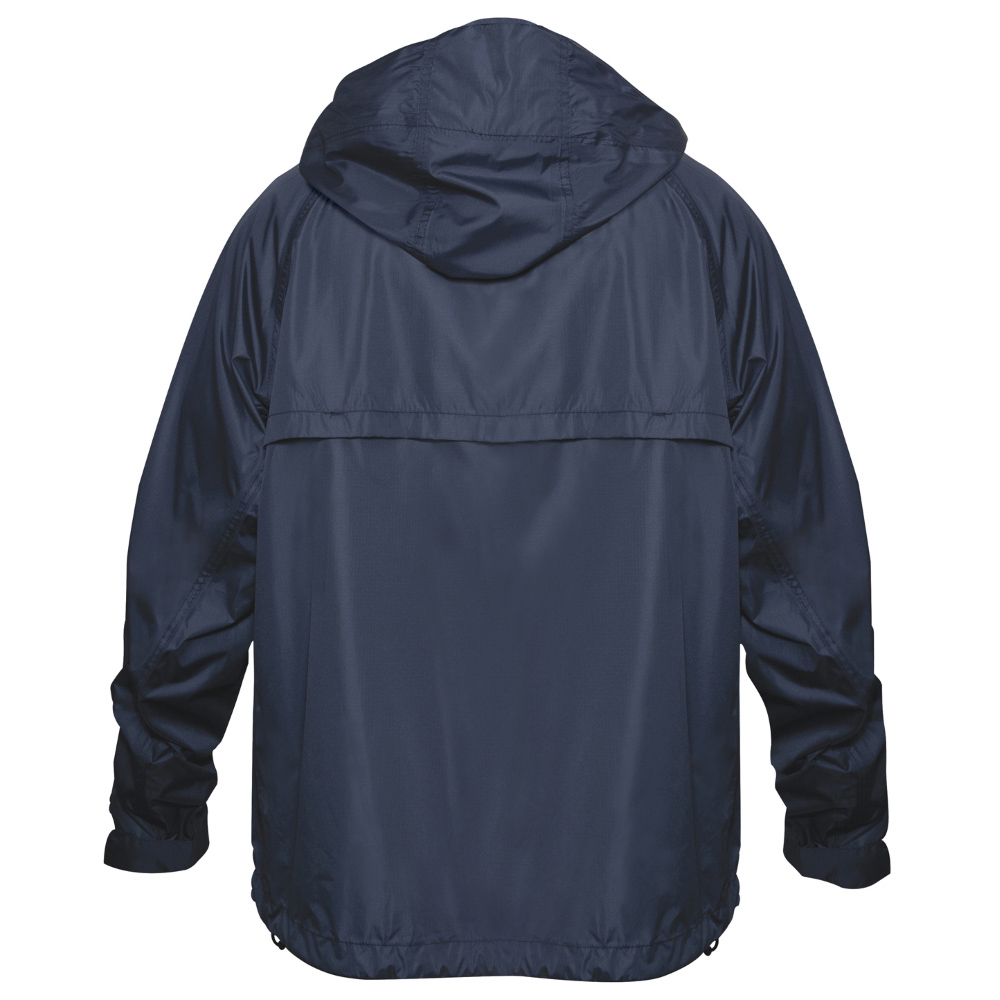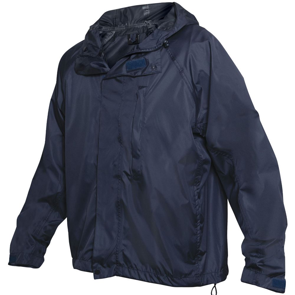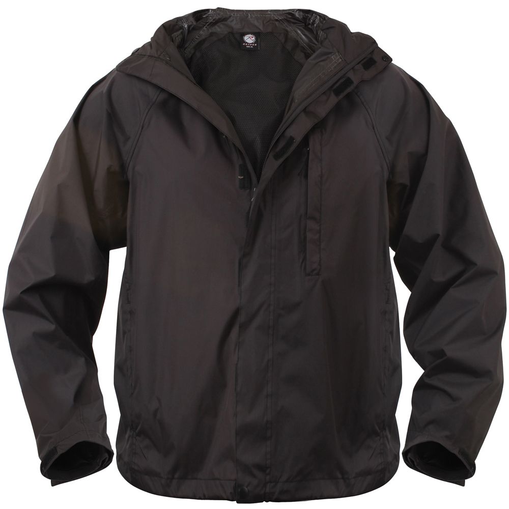 Packable Rain Black Jacket can be folded easily and packed in the zippered chest pouch. It is made of 100% rip stop polyester. The rain jacket is water proof, so you will stay dry when you go out on a rainy day. The zipper fly closure on the front with storm flap makes it easy to wear. The storm flap has hook and loop closure. The jacket has snap at waist and neck. The jacket has hood with adjustable drawstring which can be adjusted with hook and loop tabs. The waist is provided with drawstring. The jacket has front slash pockets and ventilated back with mesh interior.