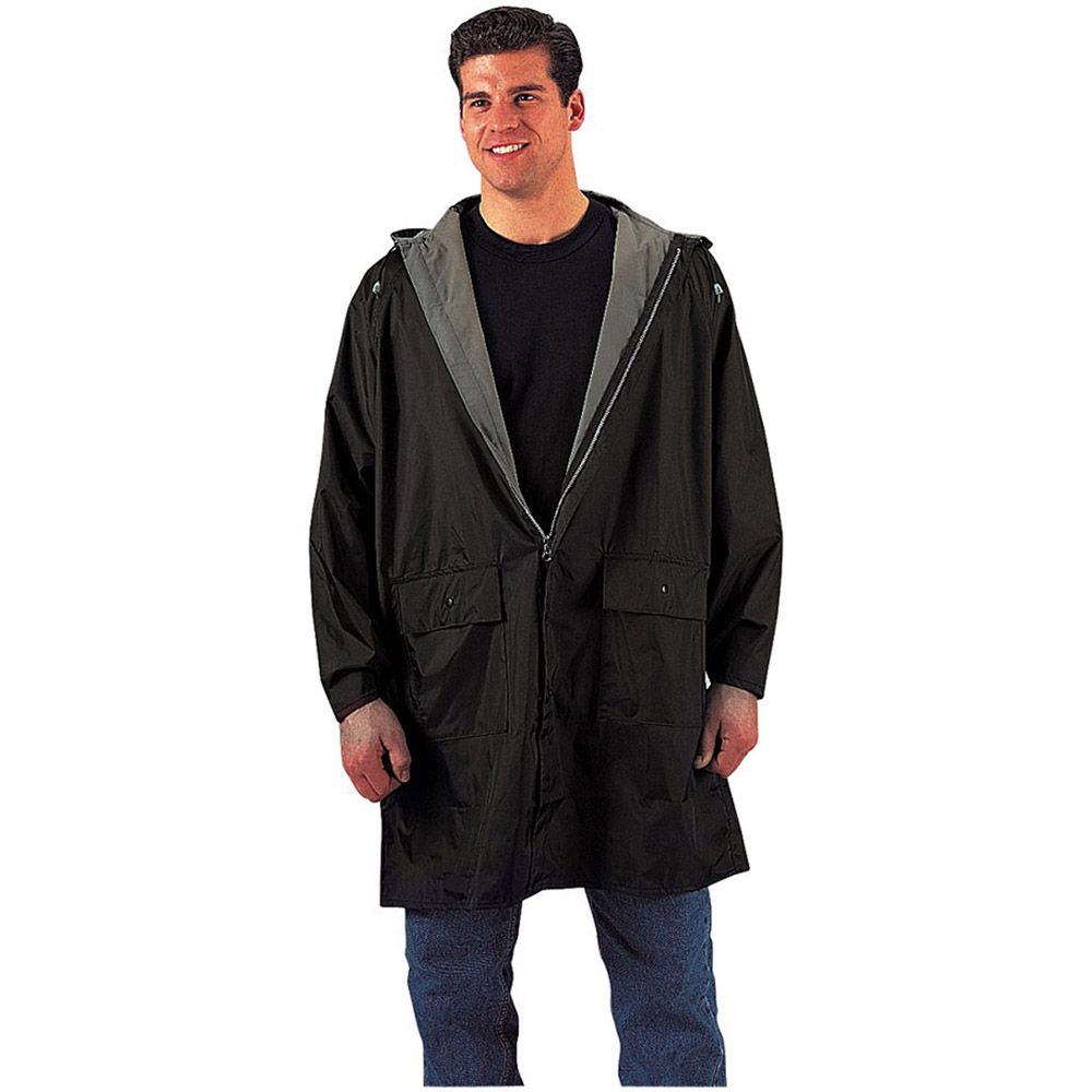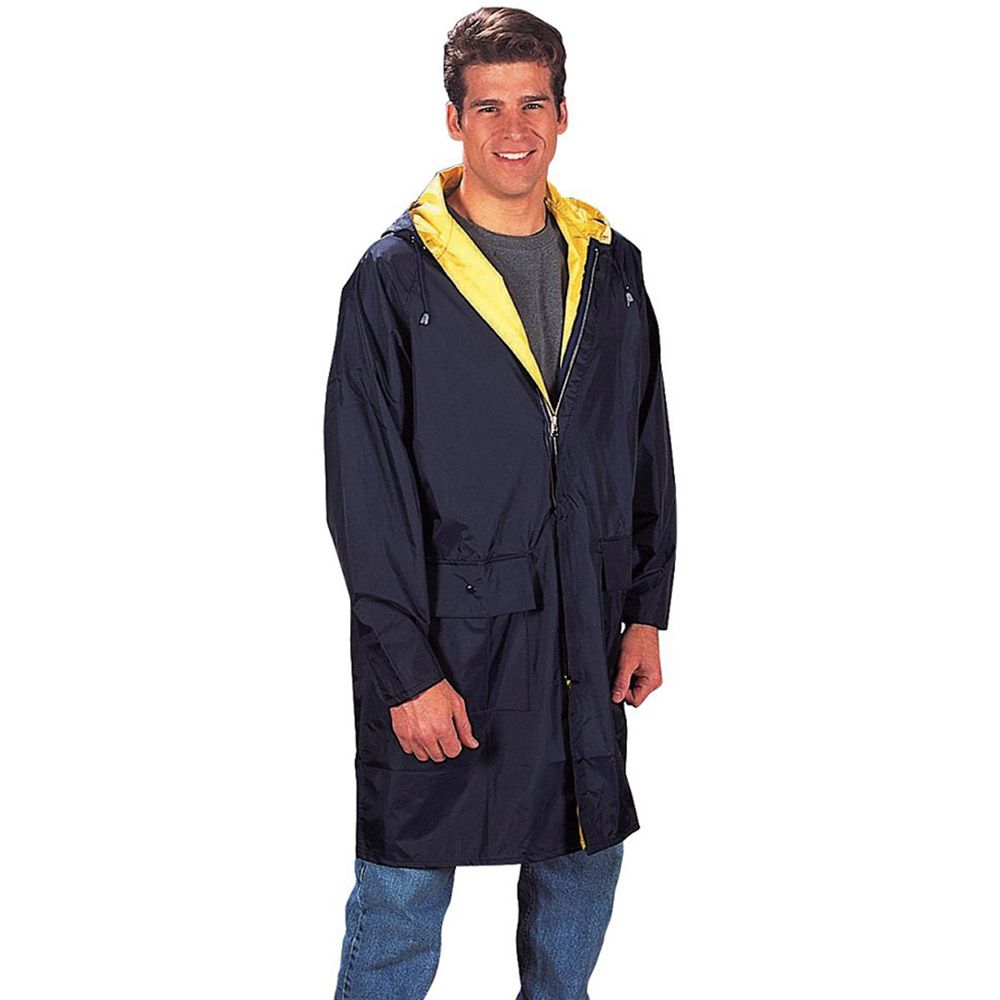 Reversible Navy Blue Yellow 3 4 Length Rain Parka is made of rubberized nylon which makes it durable and sturdy. The parka is two sided, navy blue on one side and yellow on the reverse. The 3/4 length parka is perfect to cover your body on a rainy day. It is easy and comfortable to wear as it has full length cut. The parka features zipper fly front and air vent underarms. The hood is attached to parka to keep your head dry when you go out in rain. It is completely water proof. The two flap pockets on the front side with metal snap allow keeping all your gears.