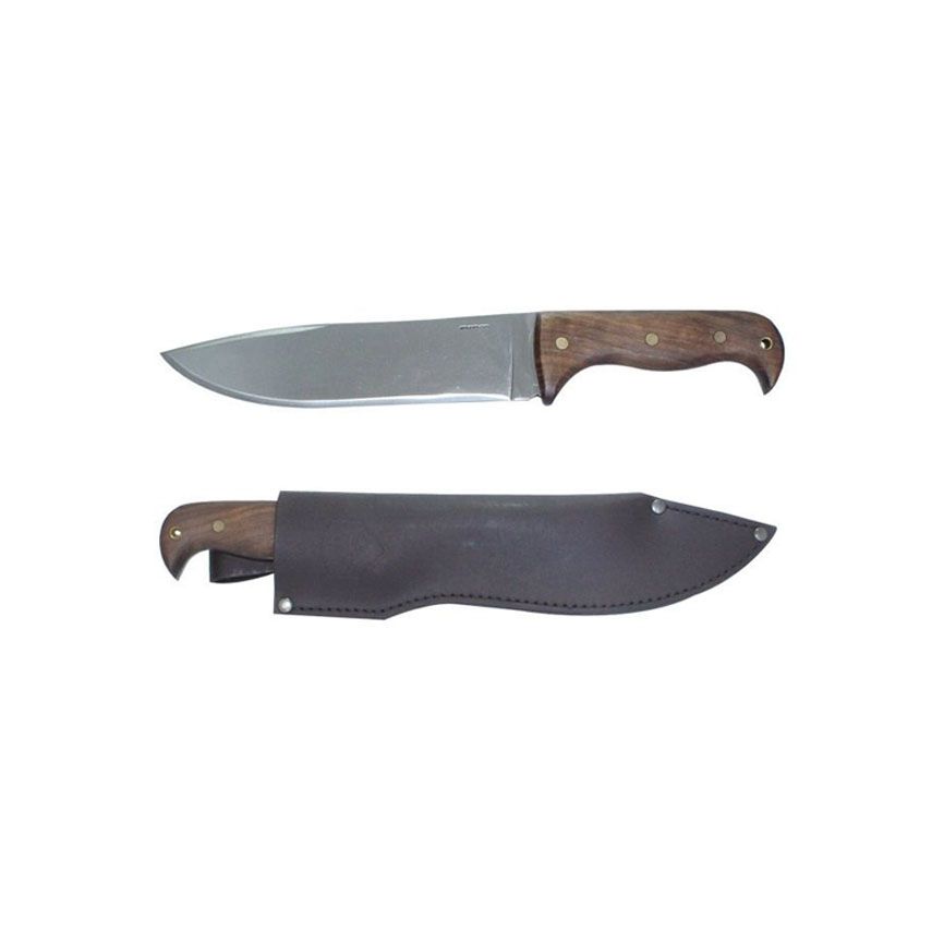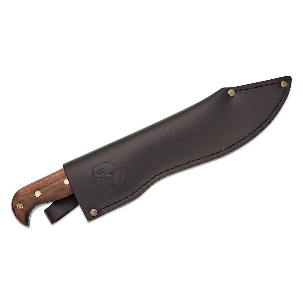 The blade is made from German 1075 High Carbon Steel and are heat treated and annealed to about 56-58 Rockwell hardness. The edge is hand finished and polished to razor sharpness. The hardwood handles are made from hard woods of Central America, similar to Hickory. It is finished with a smooth grip and is known for its long durability. Includes a high quality, heavy duty, handcrafted leather sheath with a swiveling belt loop that allows the tool to swing out of the way while moving through brush or the jungle. The tool can also be swung out of the way while riding in a truck or car, thus not poking one in the side as a conventional knife sheath.