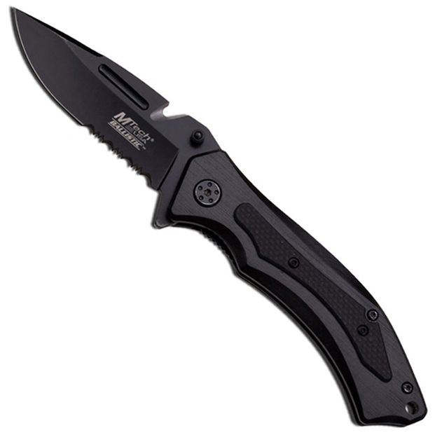 This spring assisted knife has an overall closed length of 4.75”, and a blade length of 4”. The Matte finish aluminum black handle has a G10 overlay, and the blade itself is a stainless steel black oxide and sliver. The blade is half serrated. Includes pocket clip and rescue cutter on black of blade.
