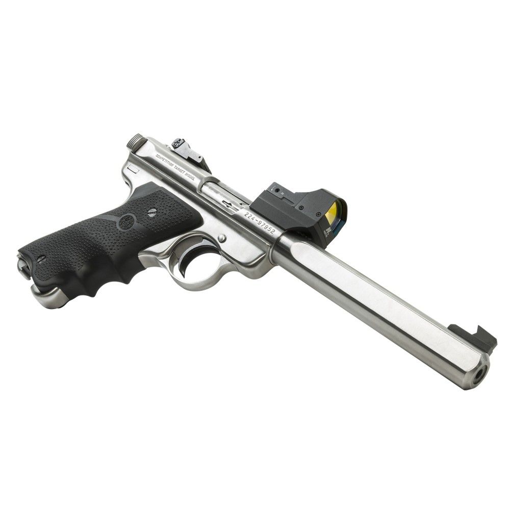 Low profile Micro Dot base mount for the Ruger® MK2 pistol with factory predrilled receiver. The easiest method to adding a Micro Dot optic to your MK2 pistol. Micro Dot allows for quick and easy target acquisition of your target. Micro Dot base mount bolts directly onto the MK2 receiver with two supplied bolts. Provides a low mounting platform for a Micro Dot reflex optic. The low profile mount allows the optic to be mounted closer to the bore of the barrel. Micro Dot base is compatible with all the NcSTAR Micro Dot type optics: DDAB, DDABG, DDABL, DXDAB, DGAB, DXGAB.