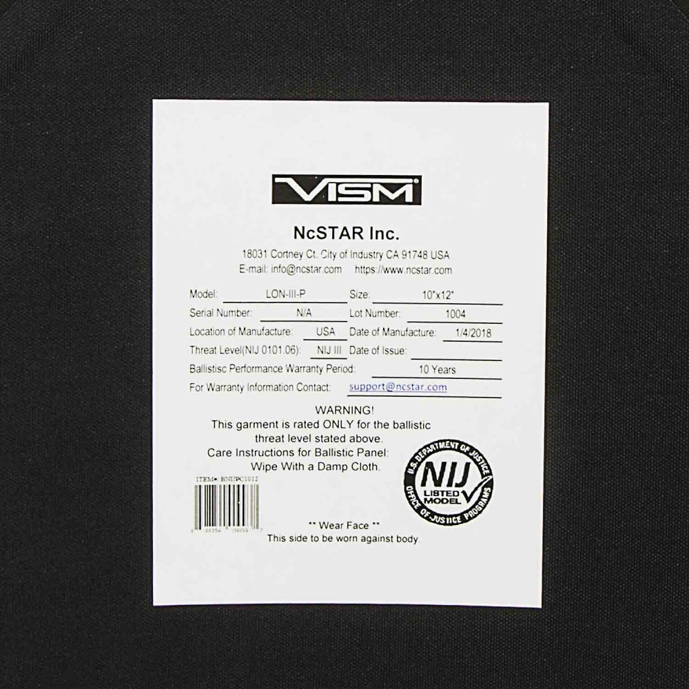 NcSTAR has received its first NIJ Certified body armor plate, the VISM Level III 10x12 Ballistic Plate.  This plate has undergone the rigorous testing process of the National Institute of Justice, and has been certified under NIJ-0101.06.  Constructed of 3 layers: the main layer is Ultra High Molecular Weight Polyethylene (UHMWPE), a special foam core that disperses energy, and a third layer of UHMWPE to sandwich the inner core.