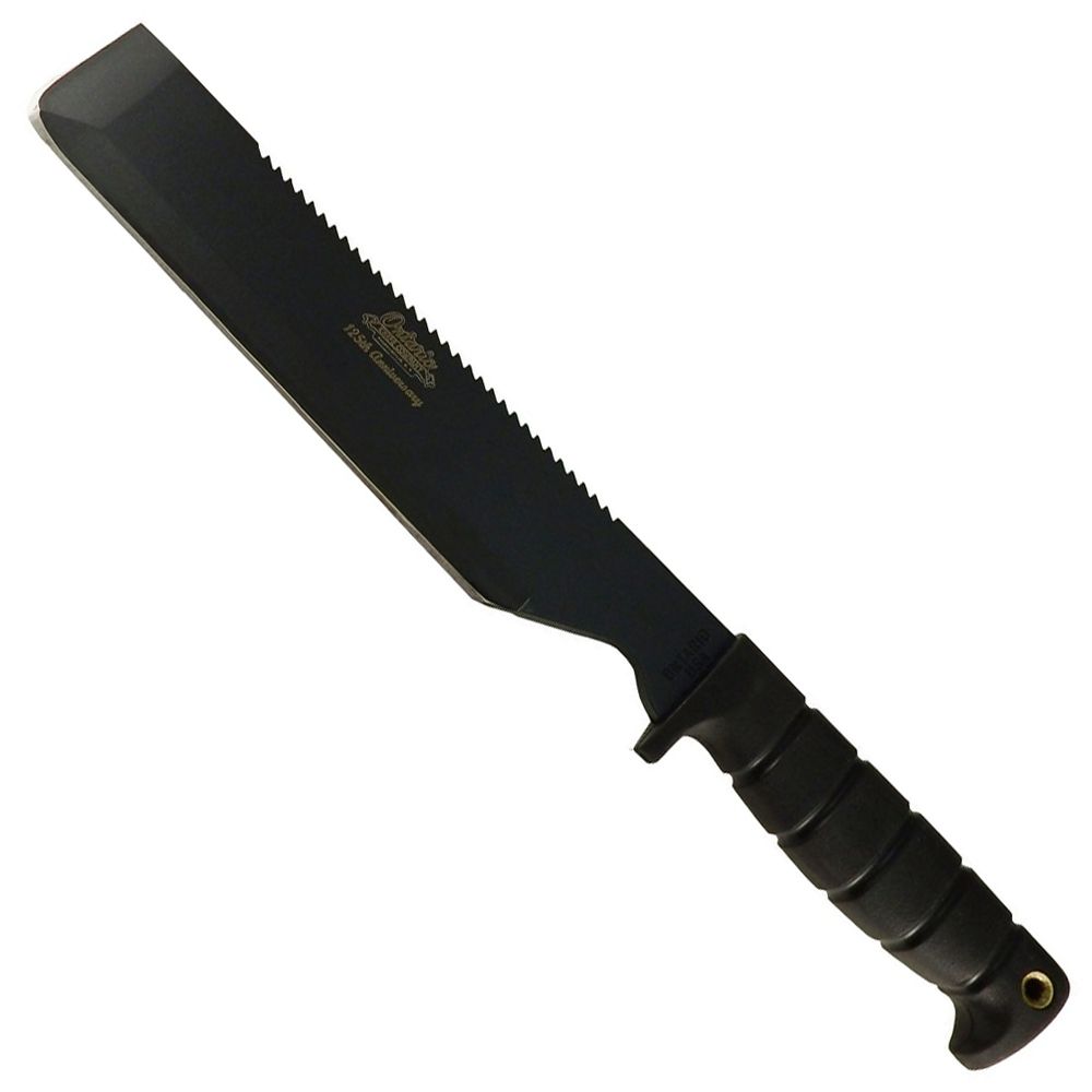 The SP8 Survival Machete is a solid full tang blade of 1095 High Carbon Steel with grooved Kraton Handle. The SP8 Survival Machete features serrations on the spine and a plain edge on the blade. The blade features a flat bevel with a secondary flat bevel at the top of the blade. A grommet on the butt of the handle allows you to hang this knife where ever you may want. This Ontario Spec Plus SP8 Survival Machete, 8683 comes with Nylon Sheath.