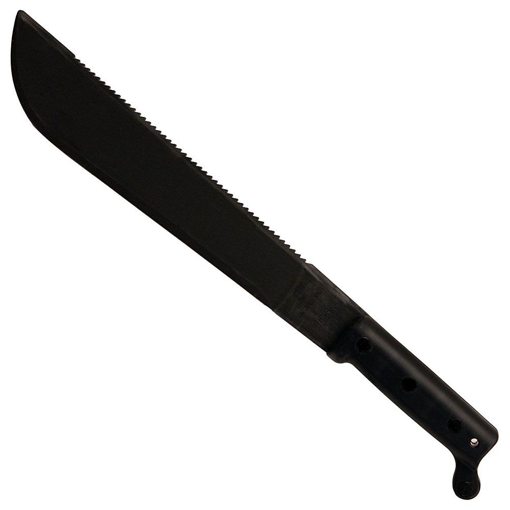 The Ontario CT2 12 Inch Sawback Machete features a 12" full tang 1095 carbon steel blade with a black zinc phosphate finish. The back of the CT2 Sawback Machete features super sharp teeth on the spine of the machete - hence "sawback" in the name.The CT2 12 Inch Sawback Machete has a high impact polymer handle that is shatterproof and features steel compression rivets. Overall, the CT2 12 Inch Sawback Machete is 17.25" long with a blade thickness of .125.