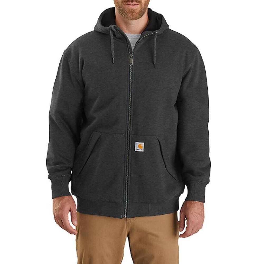 Cozy and quilted on the inside, durable and water repellent on the outside. Relaxed fit • 10.5-Ounce, 50 percent cotton/50 percent polyester blend with rain defender durable water repellent • quilt lined• attached quilt-lined extended hood for extra warmth • full-length antique nickel zipper with storm flap • two front hand warmer pockets with flaps for added security • zip-closure map pocket • hidden media pocket • stretchable, spandex-reinforced rib-knit cuffs and waistband • locker hoop facilitates hanging • Carhartt label sewn on pocket